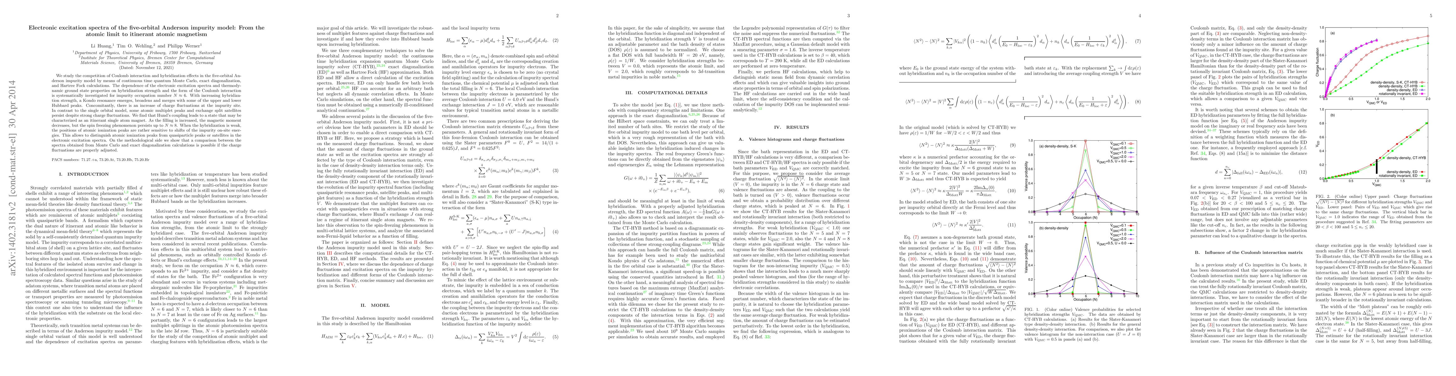 We study the competition of Coulomb interaction and hybridization effects in the five-orbital Anderson impurity model by means of continuous time quantum Monte Carlo, exact diagonalization, and Hartree Fock calculations. The dependence of the electronic excitation spectra and thermodynamic ground state properties on hybridization strength and the form of the Coulomb interaction is systematically investigated for impurity occupation number $N \approx 6$. With increasing hybridization strength, a Kondo resonance emerges, broadens and merges with some of the upper and lower Hubbard peaks. Concomitantly, there is an increase of charge fluctuations at the impurity site. In contrast to the single orbital model, some atomic multiplet peaks and exchange split satellites persist despite strong charge fluctuations. We find that Hund's coupling leads to a state that may be characterized as an itinerant single atom magnet. As the filling is increased, the magnetic moment decreases, but the spin freezing phenomenon persists up to $N\approx 8$. When the hybridization is weak, the positions of atomic ionization peaks are rather sensitive to shifts of the impurity on-site energies. This allows to distinguish atomic ionization peaks from quasiparticle peaks or satellites in the electronic excitation spectra. On the methodological side we show that a comparison between the spectra obtained from Monte Carlo and exact diagonalization calculations is possible if the charge fluctuations are properly adjusted.