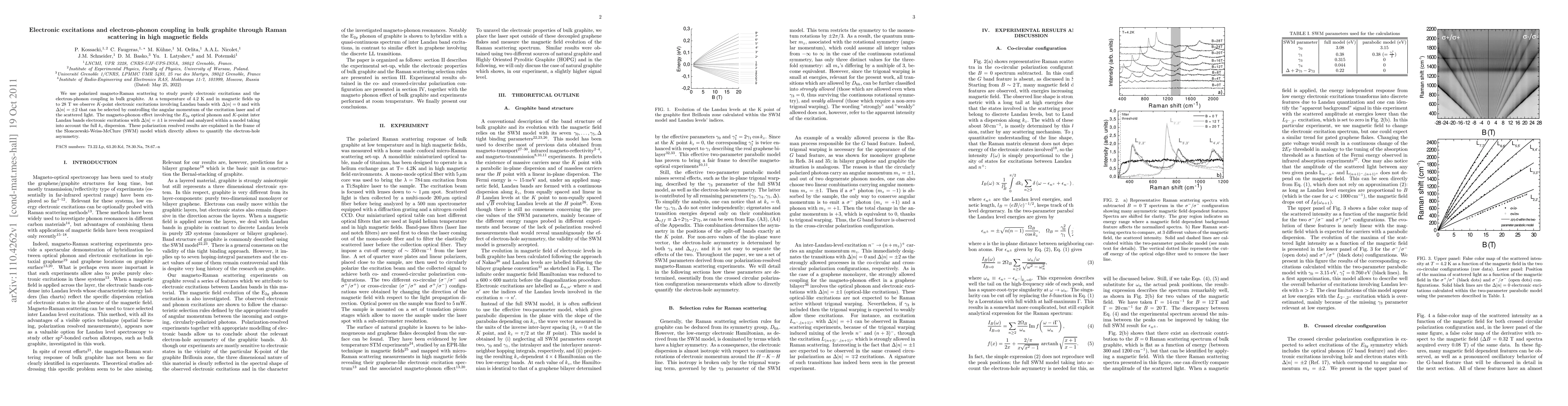 We use polarized magneto-Raman scattering to study purely electronic excitations and the electron-phonon coupling in bulk graphite. At a temperature of 4.2 K and in magnetic fields up to 28 T we observe $K$-point electronic excitations involving Landau bands with $\Delta |n|=0$ and with $\Delta |n|=\pm2$ that can be selected by controlling the angular momentum of the excitation laser and of the scattered light. The magneto-phonon effect involving the $E_{2g}$ optical phonon and $K$-point inter Landau bands electronic excitations with $\Delta |n|=\pm1$ is revealed and analyzed within a model taking into account the full $k_z$ dispersion. These polarization resolved results are explained in the frame of the Slonczewski-Weiss-McClure (SWM) model which directly allows to quantify the electron-hole asymmetry.