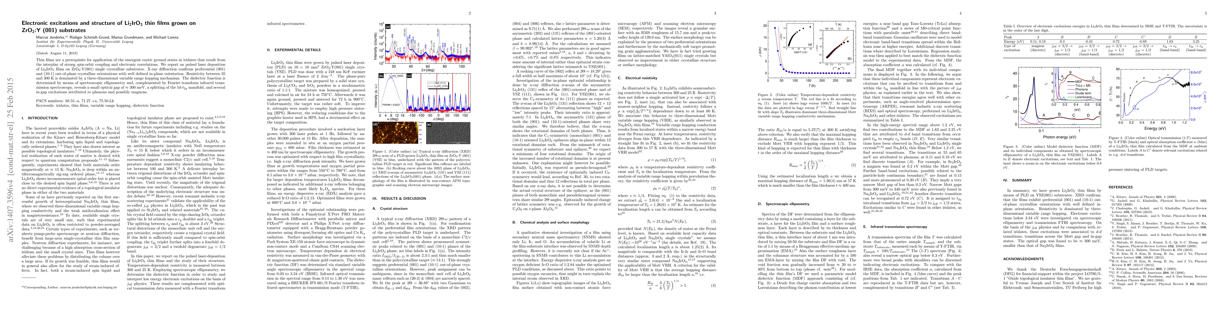 Thin films are a prerequisite for application of the emergent exotic ground states in iridates that result from the interplay of strong spin-orbit coupling and electronic correlations. We report on pulsed laser deposition of Li$_{2}$IrO$_{3}$ films on ZrO$_{2}$:Y(001) single crystalline substrates. X-ray diffraction confirms preferential (001) and (10-1) out-of-plane crystalline orientations with well defined in-plane orientation. Resistivity between 35 and 300 K is dominated by a three-dimensional variable range hopping mechanism. The dielectric function is determined by means of spectroscopic ellipsometry and, complemented by Fourier transform infrared transmission spectroscopy, reveals a small optical gap of $\approx$ 300 meV, a splitting of the $5d$-$t_{2g}$ manifold, and several in-gap excitations attributed to phonons and possibly magnons.