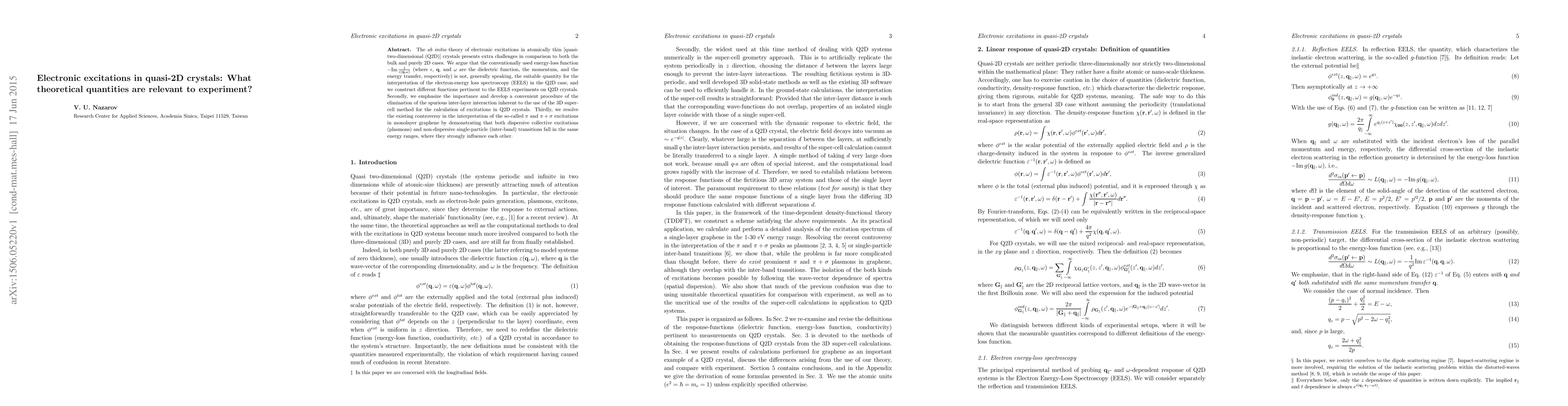 The ab initio theory of electronic excitations in atomically thin [quasi-two-dimensional (Q2D)] crystals presents extra challenges in comparison to both the bulk and purely 2D cases. We argue that the conventionally used energy-loss function $-$Im $1/\epsilon({\bf q},\omega)$ (where $\epsilon$, ${\bf q}$, and $\omega$ are the dielectric function, the momentum, and the energy transfer, respectively) is not, generally speaking, the suitable quantity for the interpretation of the electron-energy loss spectroscopy (EELS) in the Q2D case, and we construct different functions pertinent to the EELS experiments on Q2D crystals. Secondly, we emphasize the importance and develop a convenient procedure of the elimination of the spurious inter-layer interaction inherent to the use of the 3D super-cell method for the calculation of excitations in Q2D crystals. Thirdly, we resolve the existing controversy in the interpretation of the so-called $\pi$ and $\pi+\sigma$ excitations in monolayer graphene by demonstrating that both dispersive collective excitations (plasmons) and non-dispersive single-particle (inter-band) transitions fall in the same energy ranges, where they strongly influence each other.