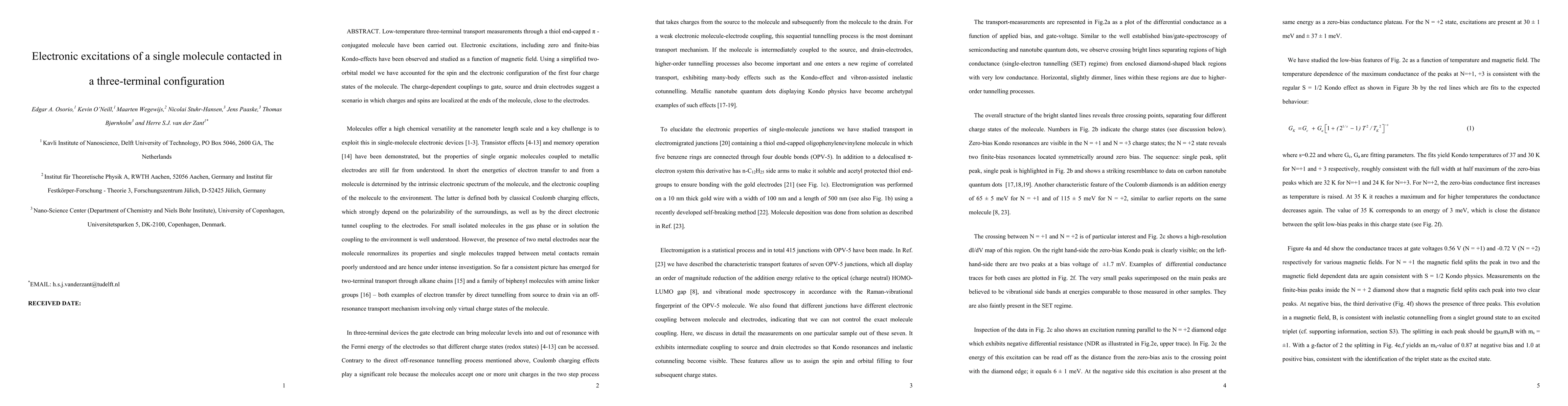 Researchers observed electronic excitations in a single molecule connected to three electrodes, finding that charges and spins are localized near the electrodes, and accounting for the spin and configuration of its charge states using a simplified model.