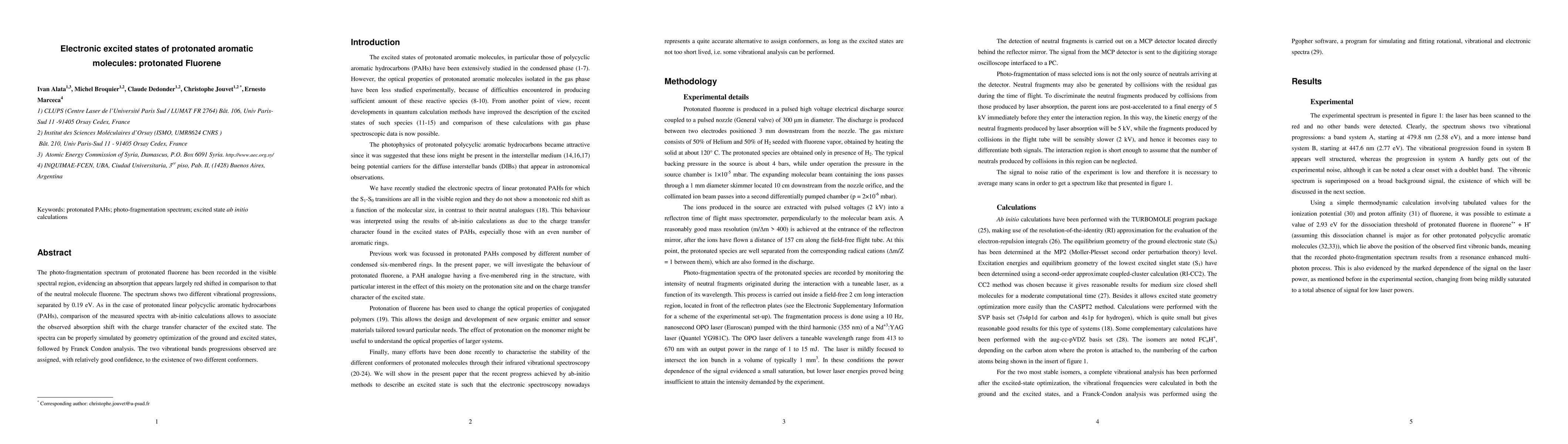 Summary: The visible spectrum of protonated fluorene reveals two red-shifted vibrational progressions attributed to different isomers, with the red shift explained by charge transfer in the excited state, as supported by ab-initio calculations.