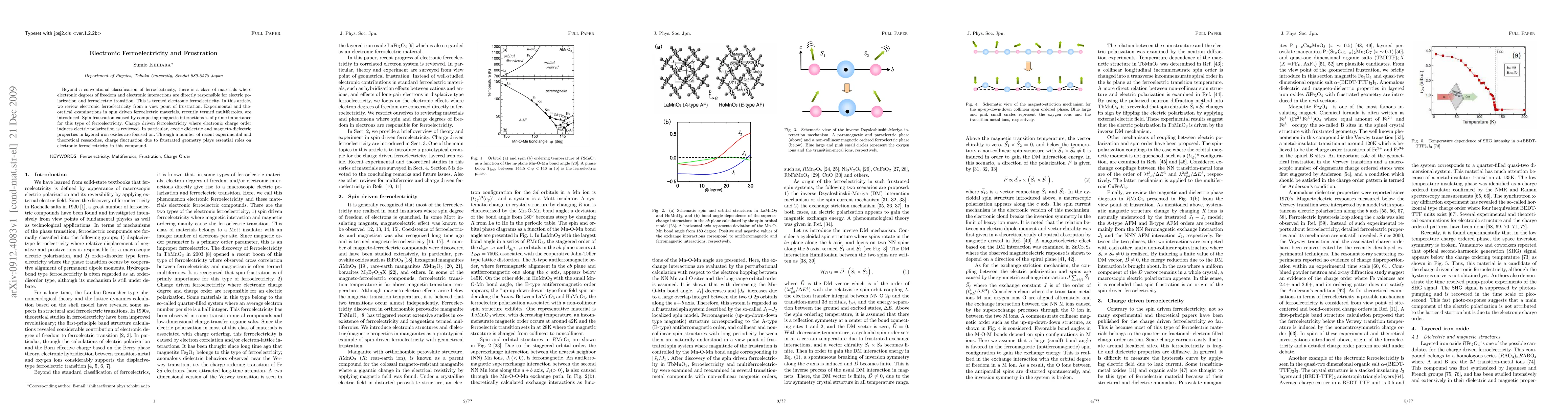 This paper reviews electronic ferroelectricity, a class of materials where electronic interactions cause electric polarization. Experimental and theoretical findings highlight the role of spin frustration and charge order in layered iron oxides.