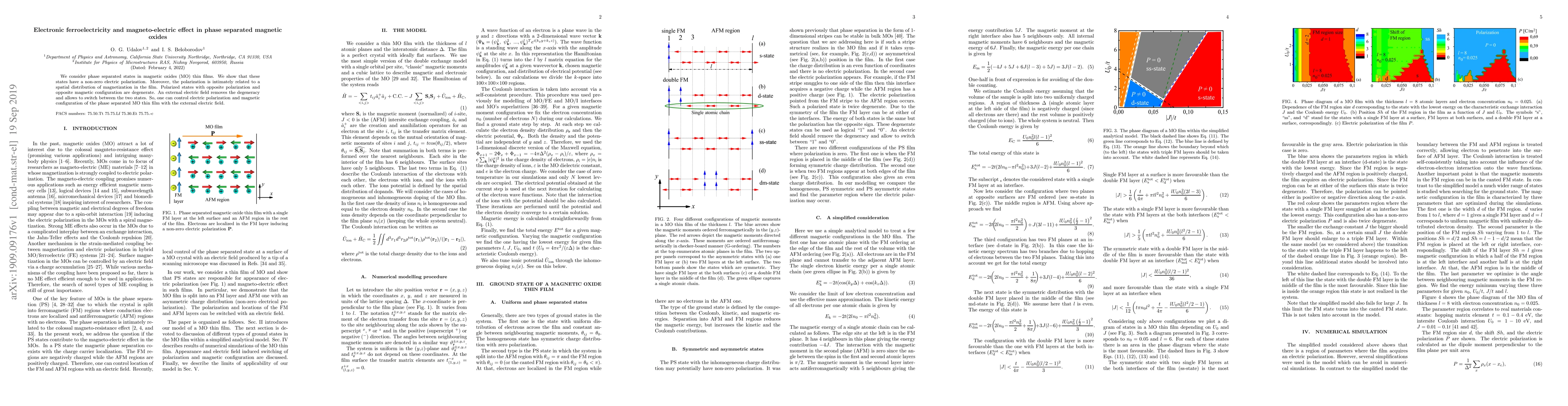 We consider phase separated states in magnetic oxides (MO) thin films. We show that these states have a non-zero electric polarization. Moreover, the polarization is intimately related to a spatial distribution of magnetization in the film. Polarized states with opposite polarization and opposite magnetic configuration are degenerate. An external electric field removes the degeneracy and allows to switch between the two states. So, one can control electric polarization and magnetic configuration of the phase separated MO thin film with the external electric field.