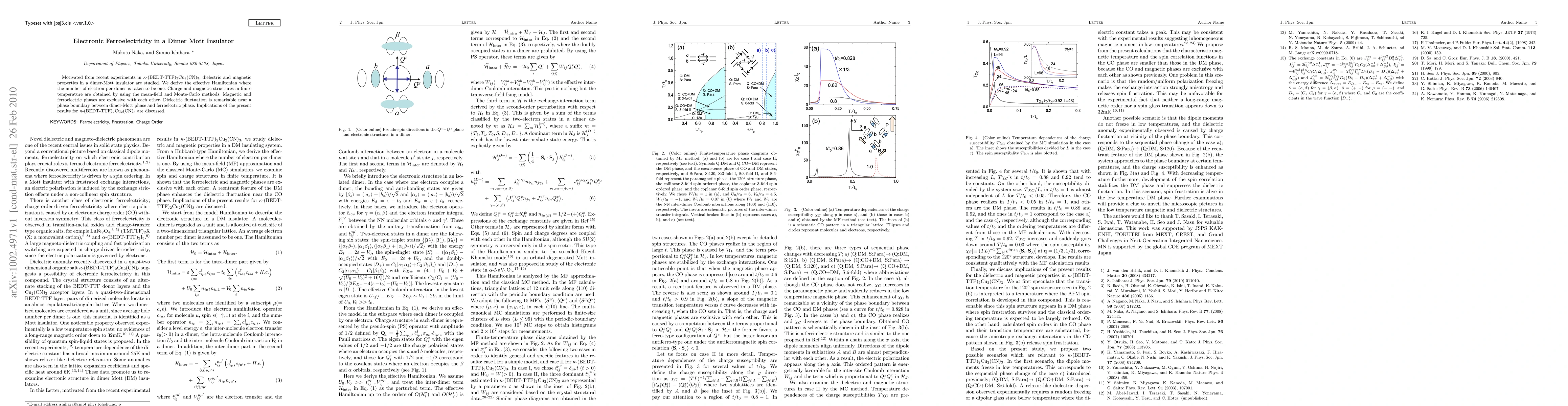 This paper investigates the electronic ferroelectricity in a dimer Mott insulator using the compound kappa-(BEDT-TTF)_2Cu_2(CN)_3 as a model. It derives an effective Hamiltonian and explores charge and magnetic structures via mean-field and Monte-Carlo methods, revealing exclusive magnetic and ferroelectric phases with significant dielectric fluctuations near their phase boundary.