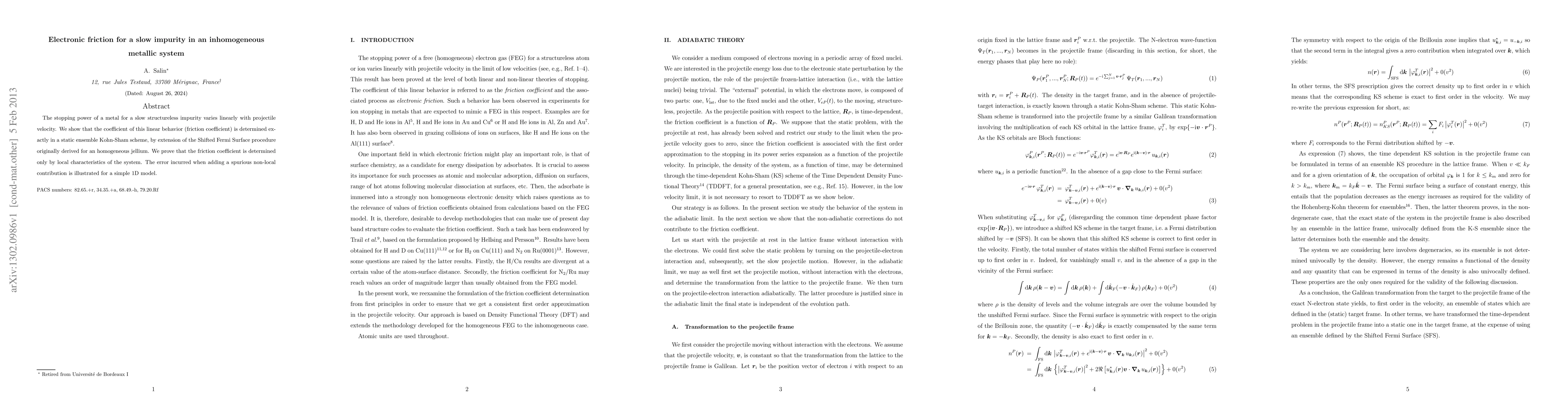 This paper determines the friction coefficient for a slow impurity in an inhomogeneous metallic system using a Kohn-Sham scheme, proving it depends solely on local system characteristics. It also demonstrates the error introduced by non-local contributions through a simple 1D model.