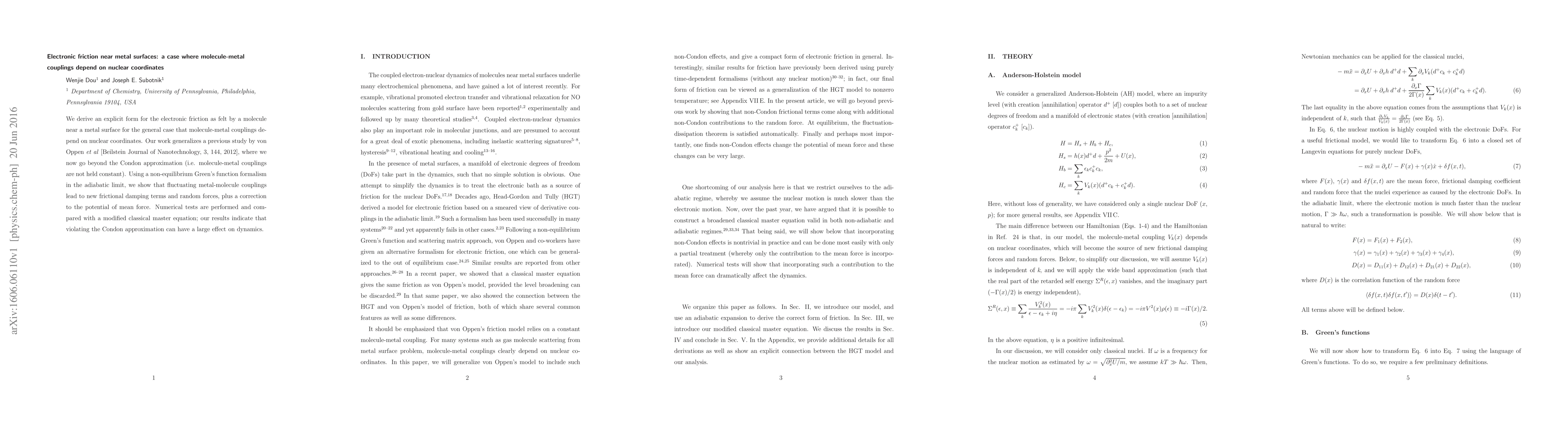 This paper derives an explicit form for electronic friction near metal surfaces, showing that molecule-metal couplings dependent on nuclear coordinates introduce new frictional damping terms and random forces. It generalizes previous work by going beyond the Condon approximation and uses non-equilibrium Green's function formalism, demonstrating significant effects on molecular dynamics.