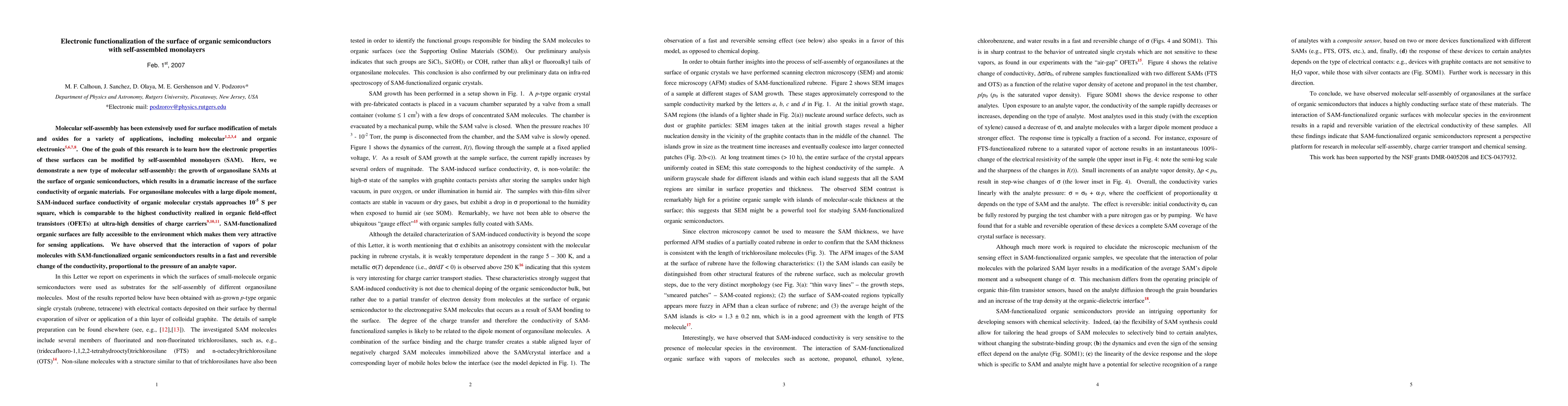 The paper presents a new approach to electronic functionalization of organic semiconductor surfaces using organosilane SAMs, leading to a significant increase in surface conductivity and sensitivity to environmental changes.
