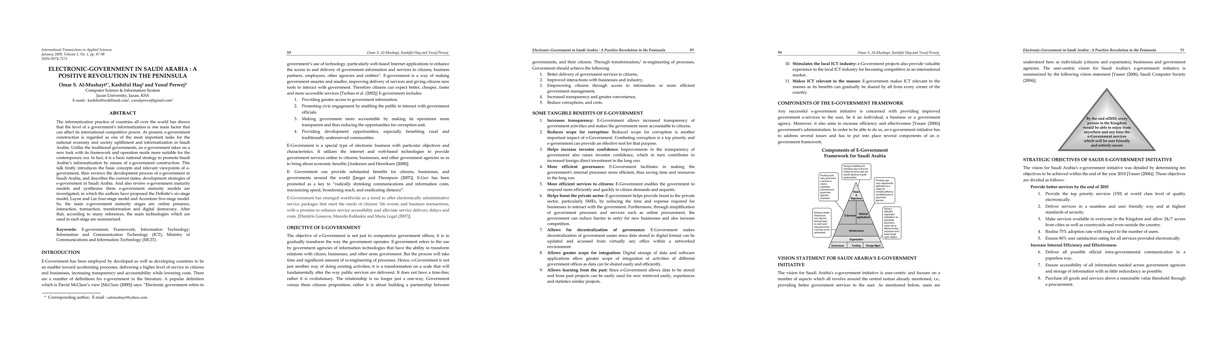 This paper explores the development and strategies of e-government in Saudi Arabia, emphasizing its role in national informatization and international competitiveness. It reviews the maturity models of e-government and identifies key technologies used in stages from online presence to digital democracy.
