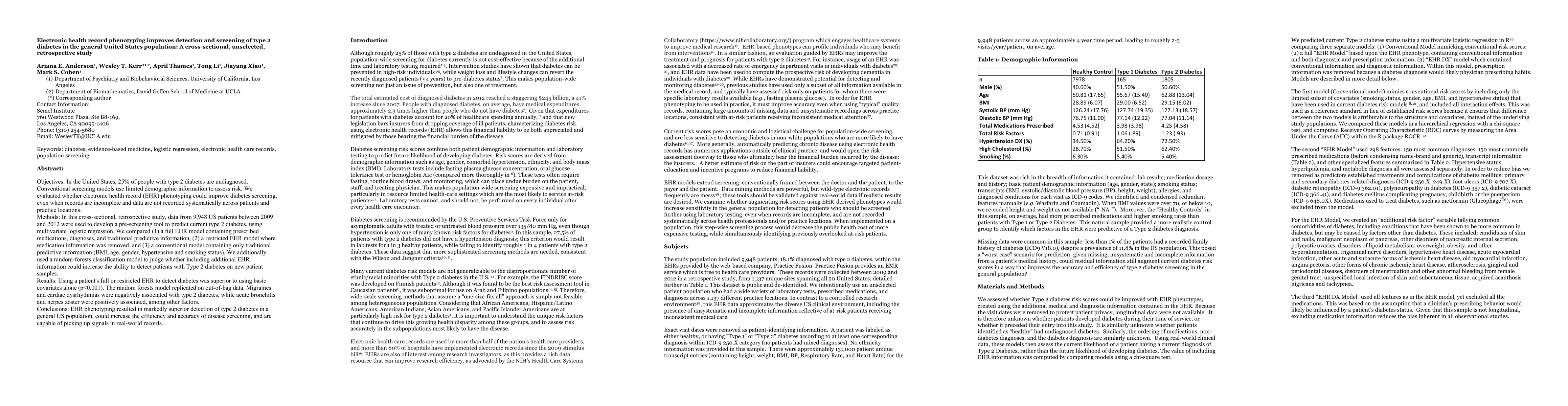 Objectives: In the United States, 25% of people with type 2 diabetes are undiagnosed. Conventional screening models use limited demographic information to assess risk. We evaluated whether electronic health record (EHR) phenotyping could improve diabetes screening, even when records are incomplete and data are not recorded systematically across patients and practice locations. Methods: In this cross-sectional, retrospective study, data from 9,948 US patients between 2009 and 2012 were used to develop a pre-screening tool to predict current type 2 diabetes, using multivariate logistic regression. We compared (1) a full EHR model containing prescribed medications, diagnoses, and traditional predictive information, (2) a restricted EHR model where medication information was removed, and (3) a conventional model containing only traditional predictive information (BMI, age, gender, hypertensive and smoking status). We additionally used a random-forests classification model to judge whether including additional EHR information could increase the ability to detect patients with Type 2 diabetes on new patient samples. Results: Using a patient's full or restricted EHR to detect diabetes was superior to using basic covariates alone (p<0.001). The random forests model replicated on out-of-bag data. Migraines and cardiac dysrhythmias were negatively associated with type 2 diabetes, while acute bronchitis and herpes zoster were positively associated, among other factors. Conclusions: EHR phenotyping resulted in markedly superior detection of type 2 diabetes in a general US population, could increase the efficiency and accuracy of disease screening, and are capable of picking up signals in real-world records.
