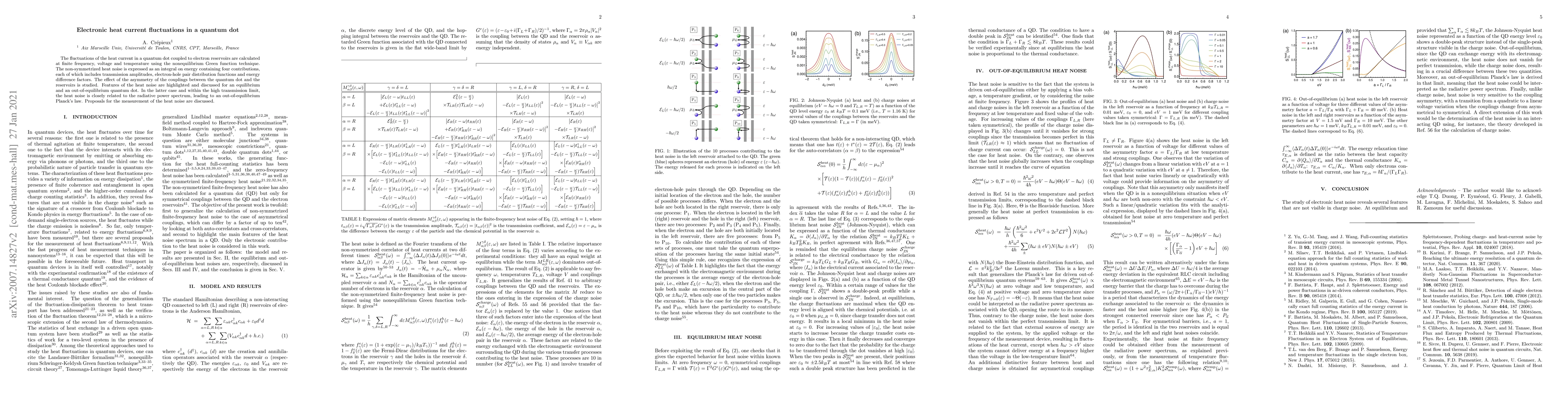 This paper calculates heat current fluctuations in a quantum dot using nonequilibrium Green's functions, identifying four contributions to the heat noise. It explores the impact of asymmetric couplings and proposes measurement techniques, revealing a connection between heat noise and the radiative power spectrum in an out-of-equilibrium state.