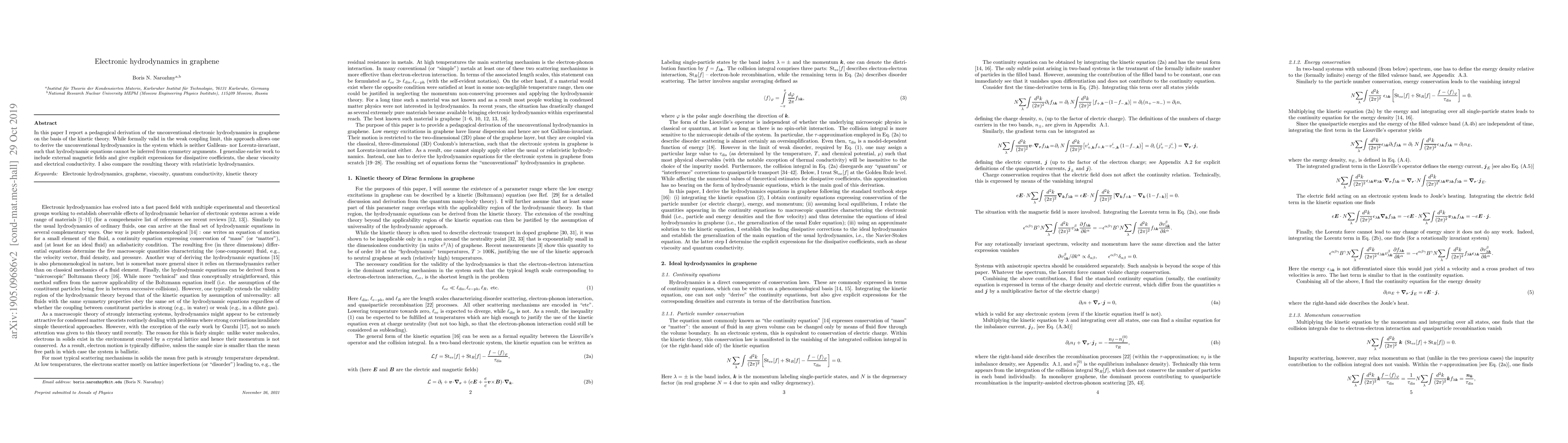 This paper derives unconventional electronic hydrodynamics in graphene using kinetic theory, including effects of external magnetic fields and comparing with relativistic hydrodynamics.