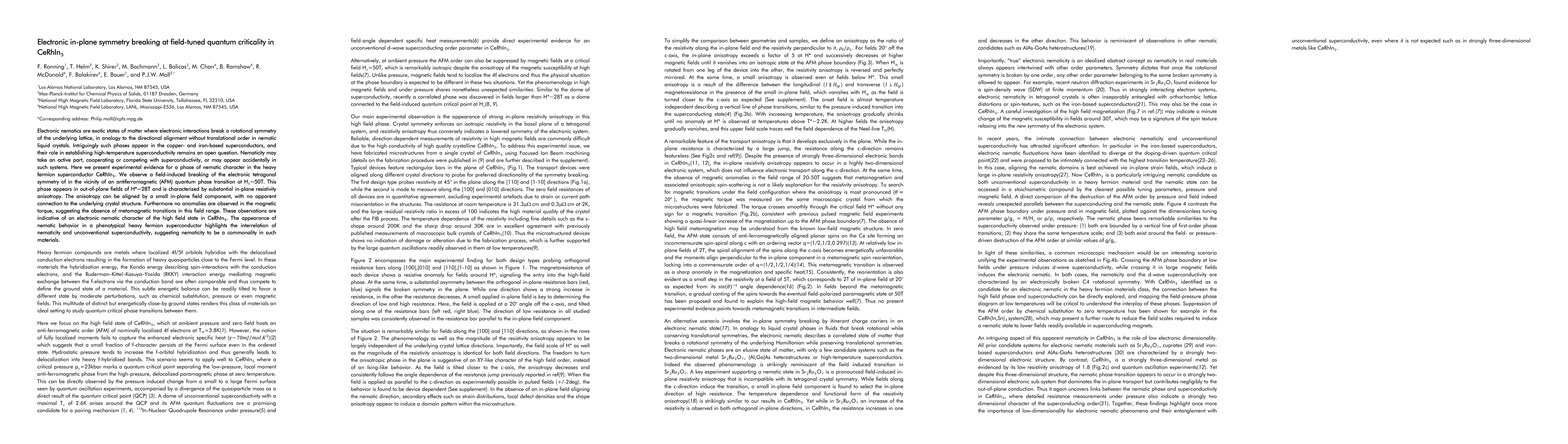 This paper reports experimental evidence for a nematic phase in the heavy fermion superconductor CeRhIn5, characterized by in-plane resistivity anisotropy and a field-induced breaking of electronic tetragonal symmetry near a quantum critical point. The findings suggest a potential link between nematicity and unconventional superconductivity in such materials.