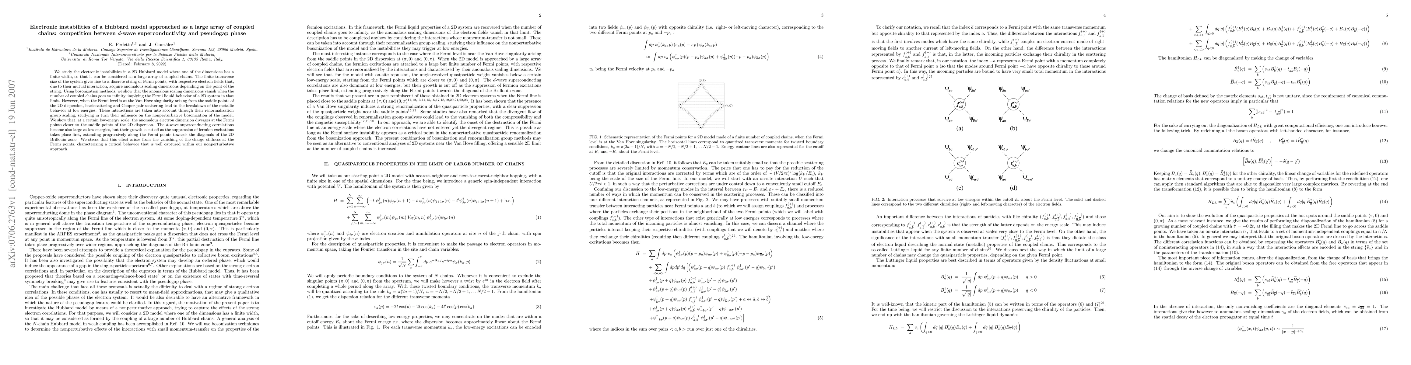 We study the electronic instabilities in a 2D Hubbard model where one of the dimensions has a finite width, so that it can be considered as a large array of coupled chains. The finite transverse size of the system gives rise to a discrete string of Fermi points, with respective electron fields that, due to their mutual interaction, acquire anomalous scaling dimensions depending on the point of the string. Using bosonization methods, we show that the anomalous scaling dimensions vanish when the number of coupled chains goes to infinity, implying the Fermi liquid behavior of a 2D system in that limit. However, when the Fermi level is at the Van Hove singularity arising from the saddle points of the 2D dispersion, backscattering and Cooper-pair scattering lead to the breakdown of the metallic behavior at low energies. These interactions are taken into account through their renormalization group scaling, studying in turn their influence on the nonperturbative bosonization of the model. We show that, at a certain low-energy scale, the anomalous electron dimension diverges at the Fermi points closer to the saddle points of the 2D dispersion. The d-wave superconducting correlations become also large at low energies, but their growth is cut off as the suppression of fermion excitations takes place first, extending progressively along the Fermi points towards the diagonals of the 2D Brillouin zone. We stress that this effect arises from the vanishing of the charge stiffness at the Fermi points, characterizing a critical behavior that is well captured within our nonperturbative approach.