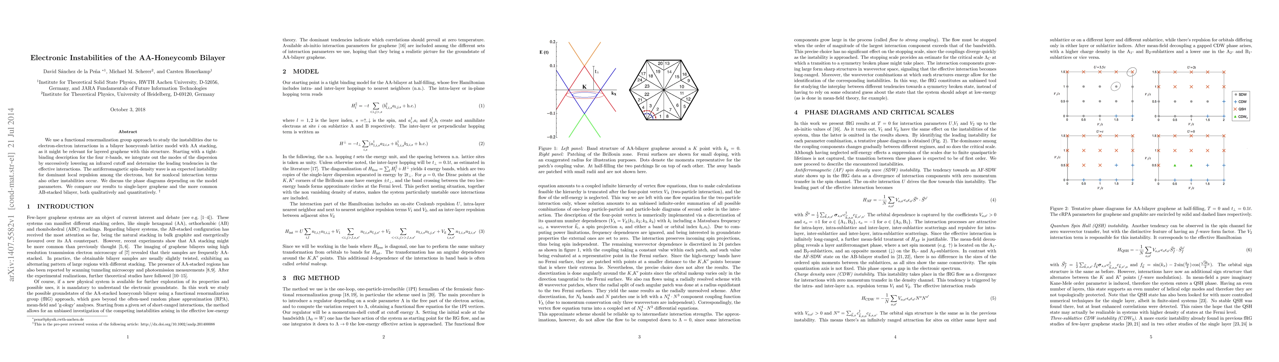 We use a functional renormalization group approach to study the instabilities due to electron-electron interactions in a bilayer honeycomb lattice model with AA stacking, as it might be relevant for layered graphene with this structure. Starting with a tight- binding description for the four $\pi$-bands, we integrate out the modes of the dispersion by successively lowering an infrared cutoff and determine the leading tendencies in the effective interactions. The antiferromagnetic spin-density wave is an expected instability for dominant local repulsion among the electrons, but for nonlocal interaction terms also other instabilities occur. We discuss the phase diagrams depending on the model parameters. We compare our results to single-layer graphene and the more common AB-stacked bilayer, both qualitatively and quantitatively.