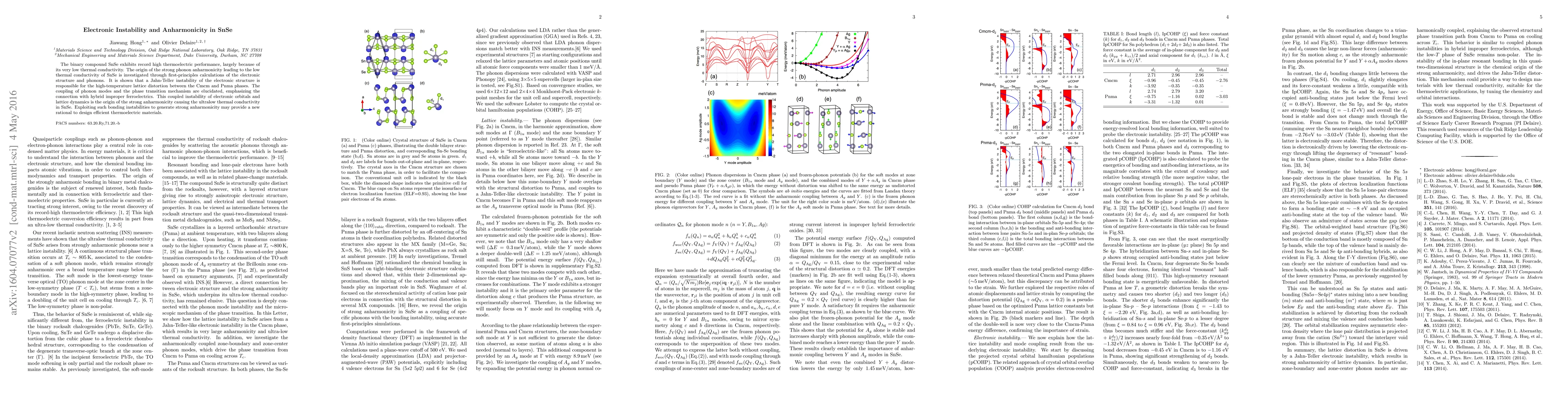 SnSe's exceptional thermoelectric performance is attributed to ultralow thermal conductivity due to strong phonon anharmonicity, driven by a Jahn-Teller electronic instability that causes lattice distortion and a phase transition. This instability connects electronic orbital coupling with lattice dynamics, offering a pathway for designing better thermoelectric materials.