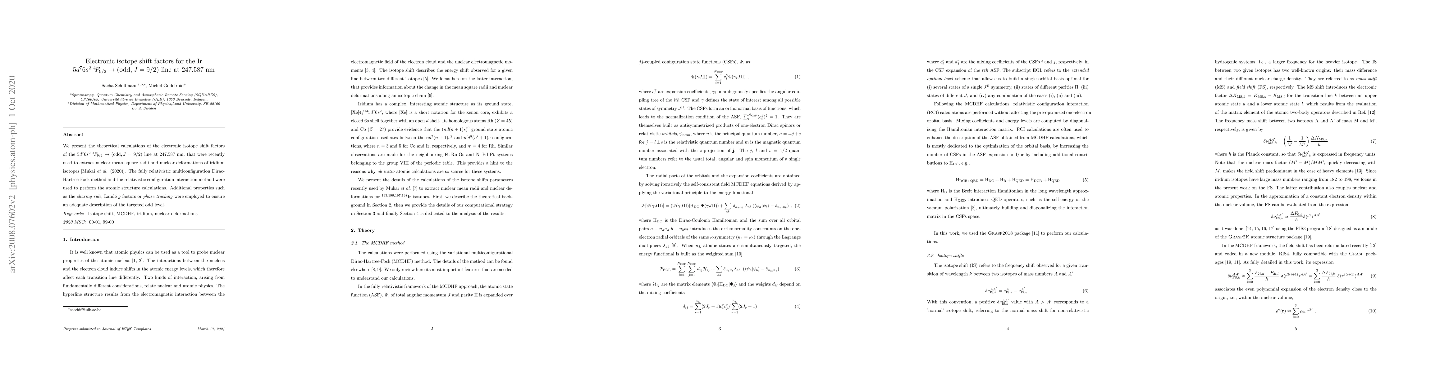 We present the theoretical calculations of the electronic isotope shift factors of the $5d^{7}6s^{2} \ ^{4}\!F_{9/2} \to (\mbox{odd},J= 9/2)$ line at 247.587 nm, that were recently used to extract nuclear mean square radii and nuclear deformations of iridium isotopes [Mukai $\textit{et al.}$ (2020)]. The fully relativistic multiconfiguration Dirac-Hartree-Fock method and the relativistic configuration interaction method were used to perform the atomic structure calculations. Additional properties such as the $\textit{sharing rule}$, Land\'e $g$ factors or $\textit{phase tracking}$ were employed to ensure an adequate description of the targeted odd level.