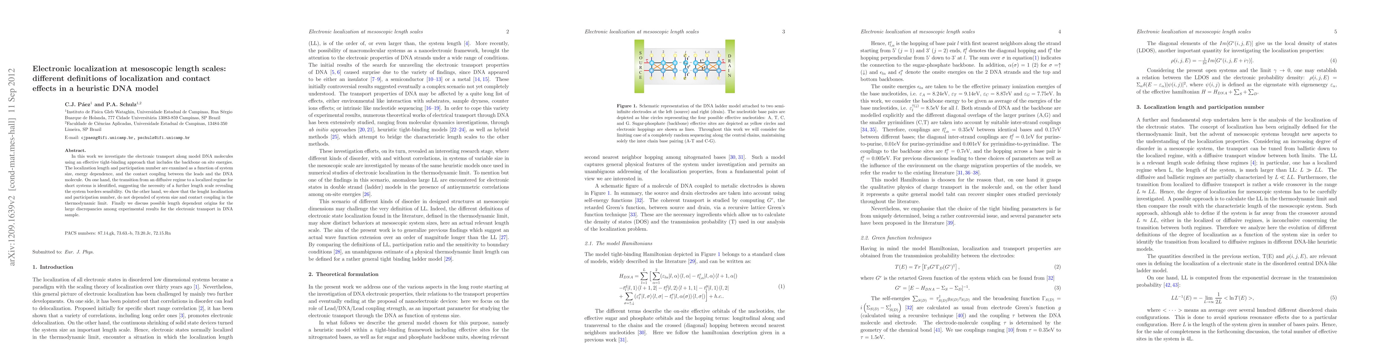 In this work we investigate the electronic transport along model DNA molecules using an effective tight-binding approach that includes the backbone on site energies. The localization length and participation number are examined as a function of system size, energy dependence, and the contact coupling between the leads and the DNA molecule. On one hand, the transition from an diffusive regime to a localized regime for short systems is identified, suggesting the necessity of a further length scale revealing the system borders sensibility. On the other hand, we show that the lenght localization and participation number, do not depended of system size and contact coupling in the thermodynamic limit. Finally we discuss possible length dependent origins for the large discrepancies among experimental results for the electronic transport in DNA sample.