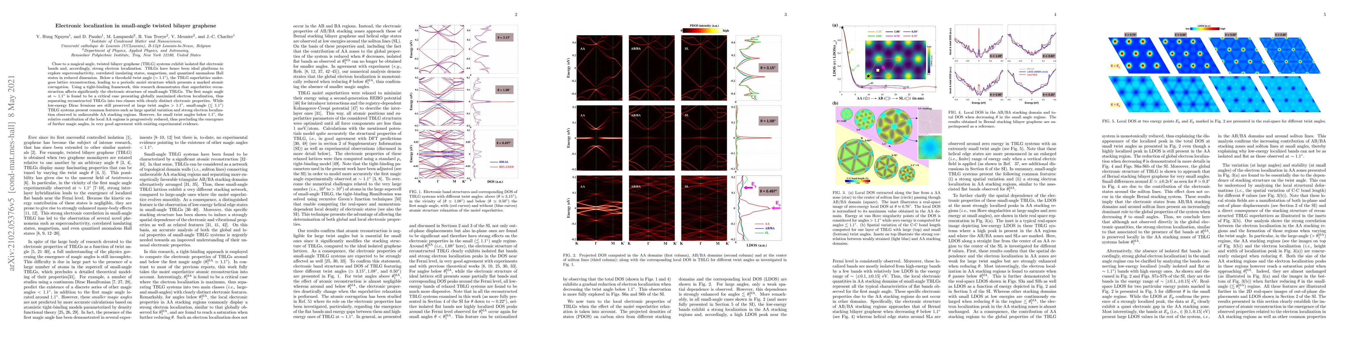 This paper investigates the electronic localization in small-angle twisted bilayer graphene (TBLG), showing that lattice reconstruction below a twist angle of $1.1^\circ$ leads to significant changes in the electronic structure, resulting in distinct classes of TBLG with either strong electron localization or preserved low-energy Dirac fermions.