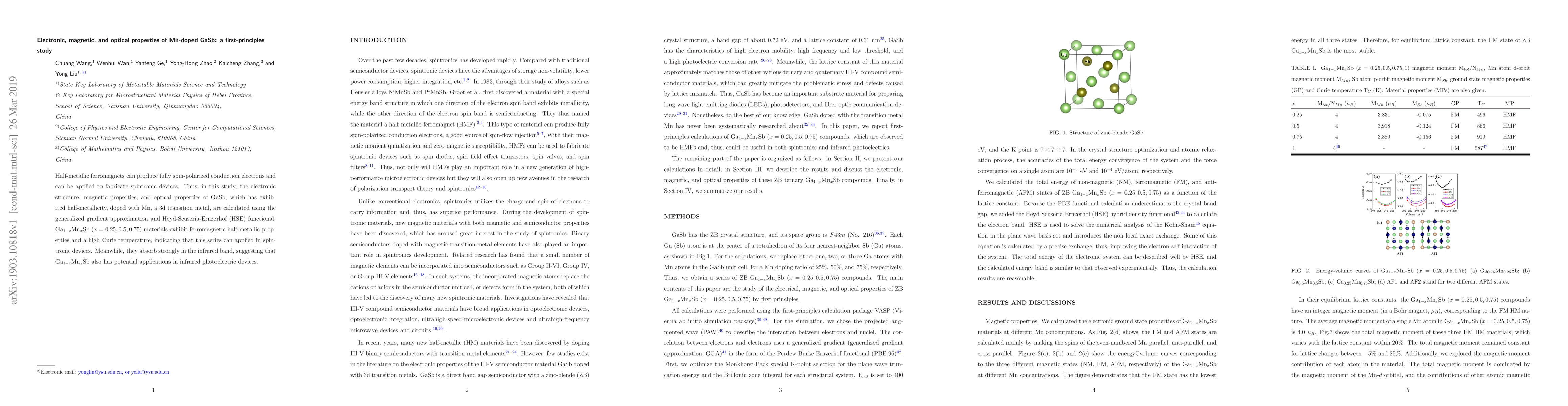 This study investigates the electronic, magnetic, and optical properties of Mn-doped GaSb using first-principles calculations. The results show that Ga$_{1-x}$Mn$_x$Sb exhibits ferromagnetic half-metallicity and high Curie temperatures, making it suitable for spintronic devices, while also absorbing strongly in the infrared band, indicating potential for infrared photoelectric applications.