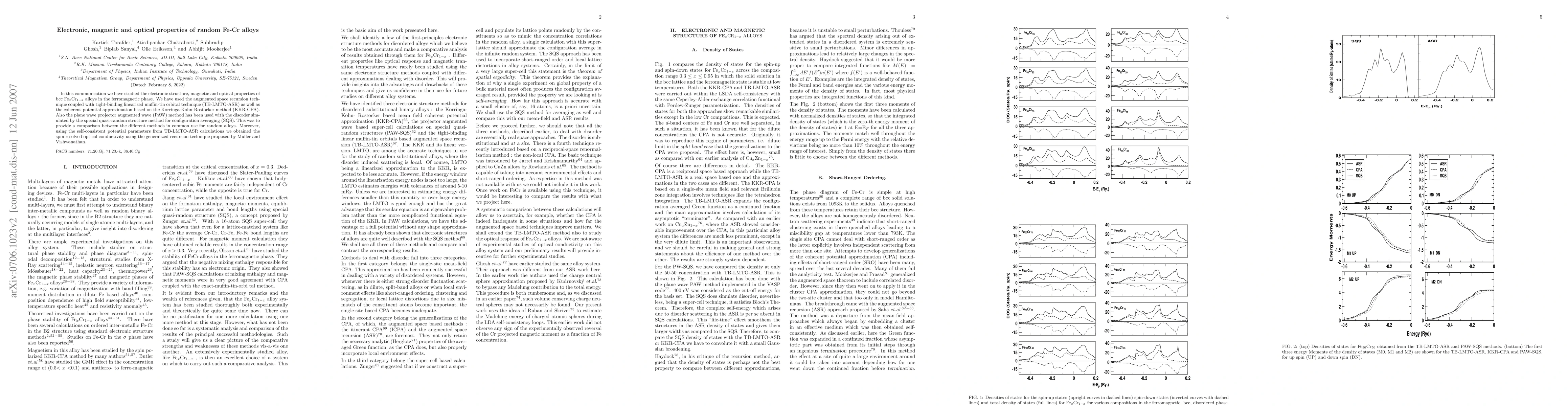 In this communication we have studied the electronic structure, magnetic and optical properties of bcc \fecr alloys in the ferromagnetic phase. We have used the augmented space recursion technique coupled with tight-binding linearized muffin-tin orbital technique (TB-LMTO-ASR) as well as the coherent-potential approximation based on the Korringa-Kohn-Rostocker method (KKR-CPA). Also the plane wave projector augmented wave (PAW) method has been used with the disorder simulated by the special quasi-random structure method f or configuration averaging (SQS). This was to provide a comparison between the different methods in common use for random alloys. Moreover, using the self-consistent potential parameters from TB-LMTO-ASR ca lculations we obtained the spin resolved optical conductivity using the generalized recursion technique proposed by M\"uller and Vishwanathan.