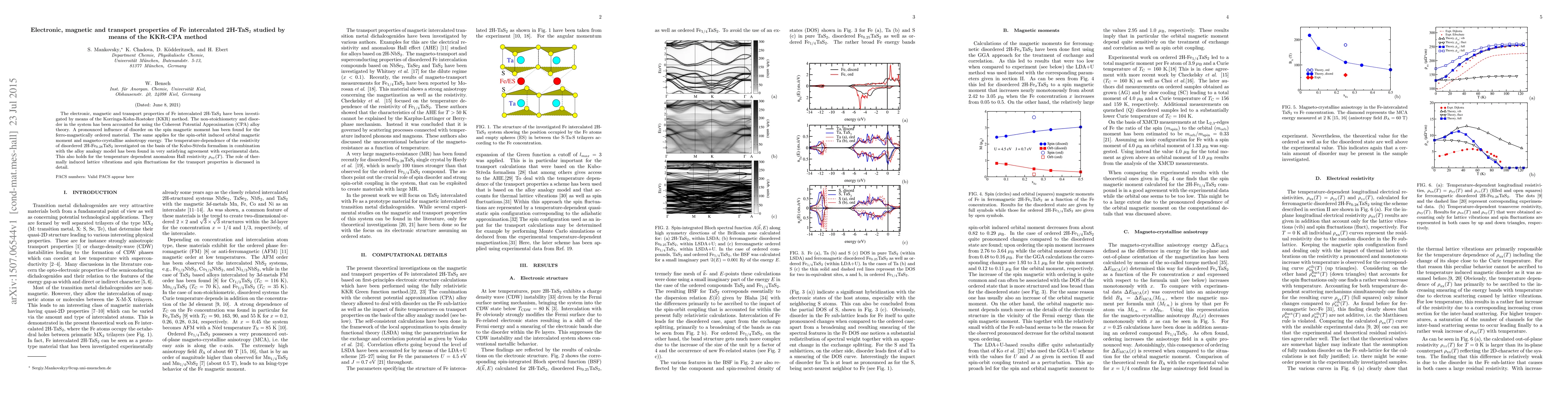 The electronic, magnetic and transport properties of Fe intercalated 2H-TaS$_2$ have been investigated by means of the Korringa-Kohn-Rostoker (KKR) method. The non-stoichiometry and disorder in the system has been accounted for using the Coherent Potential Approximation (CPA) alloy theory. A pronounced influence of disorder on the spin magnetic moment has been found for the ferro-magnetically ordered material. The same applies for the spin-orbit induced orbital magnetic moment and magneto-crystalline anisotropy energy. The temperature-dependence of the resistivity of disordered 2H-Fe$_{0.28}$TaS$_2$ investigated on the basis of the Kubo-St\v{r}eda formalism in combination with the alloy analogy model has been found in very satisfying agreement with experimental data. This also holds for the temperature dependent anomalous Hall resistivity $ \rho_{\rm xy}(T) $. The role of thermally induced lattice vibrations and spin fluctuations for the transport properties is discussed in detail.