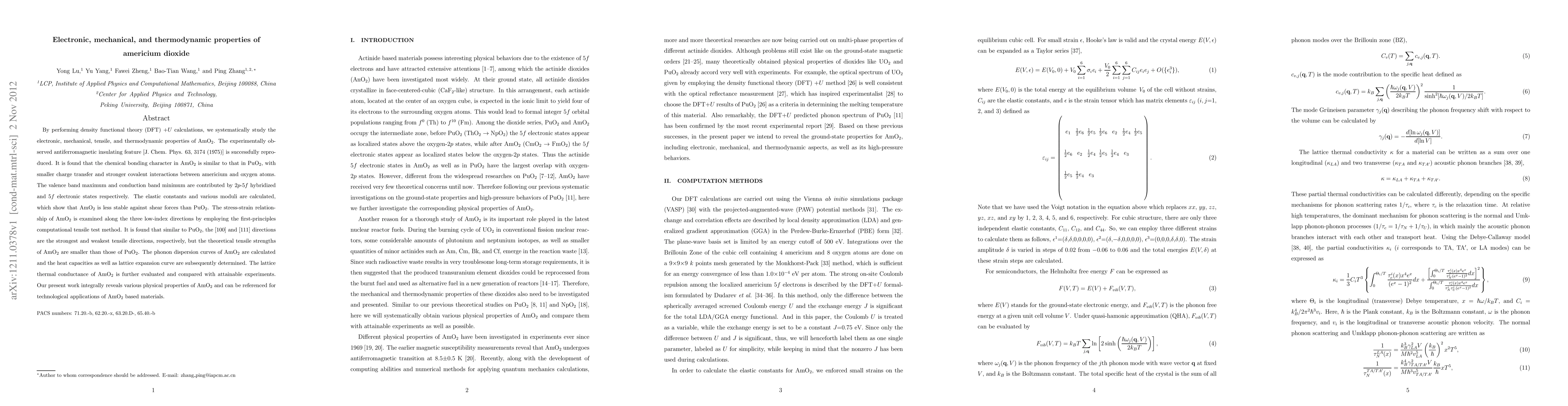 By performing density functional theory (DFT) +$U$ calculations, we systematically study the electronic, mechanical, tensile, and thermodynamic properties of AmO$_{2}$. The experimentally observed antiferromagnetic insulating feature [J. Chem. Phys. 63, 3174 (1975)] is successfully reproduced. It is found that the chemical bonding character in AmO$_{2}$ is similar to that in PuO$_{2}$, with smaller charge transfer and stronger covalent interactions between americium and oxygen atoms. The valence band maximum and conduction band minimum are contributed by 2$p-5f$ hybridized and 5$f$ electronic states respectively. The elastic constants and various moduli are calculated, which show that AmO$_{2}$ is less stable against shear forces than PuO$_{2}$. The stress-strain relationship of AmO$_{2}$ is examined along the three low-index directions by employing the first-principles computational tensile test method. It is found that similar to PuO$_{2}$, the [100] and [111] directions are the strongest and weakest tensile directions, respectively, but the theoretical tensile strengths of AmO$_{2}$ are smaller than those of PuO$_{2}$. The phonon dispersion curves of AmO$_{2}$ are calculated and the heat capacities as well as lattice expansion curve are subsequently determined. The lattice thermal conductance of AmO$_{2}$ is further evaluated and compared with attainable experiments. Our present work integrally reveals various physical properties of AmO$_{2}$ and can be referenced for technological applications of AmO$_{2}$ based materials.