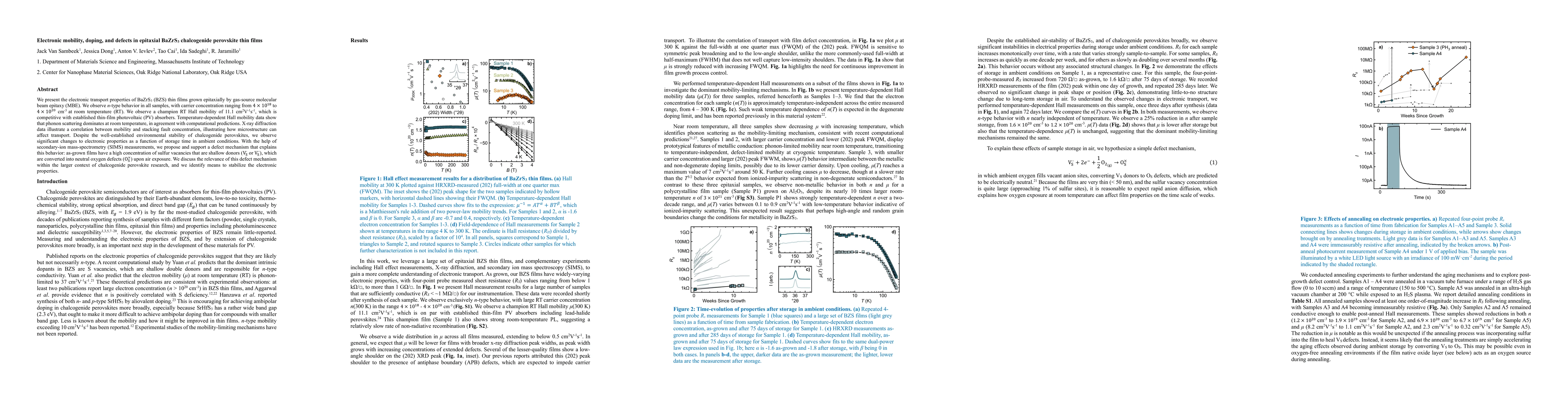 The paper presents a detailed analysis of electronic mobility, doping, and defects in epitaxial BaZrS3 thin films, proposing a defect mechanism involving sulfur vacancies and oxygen defects.