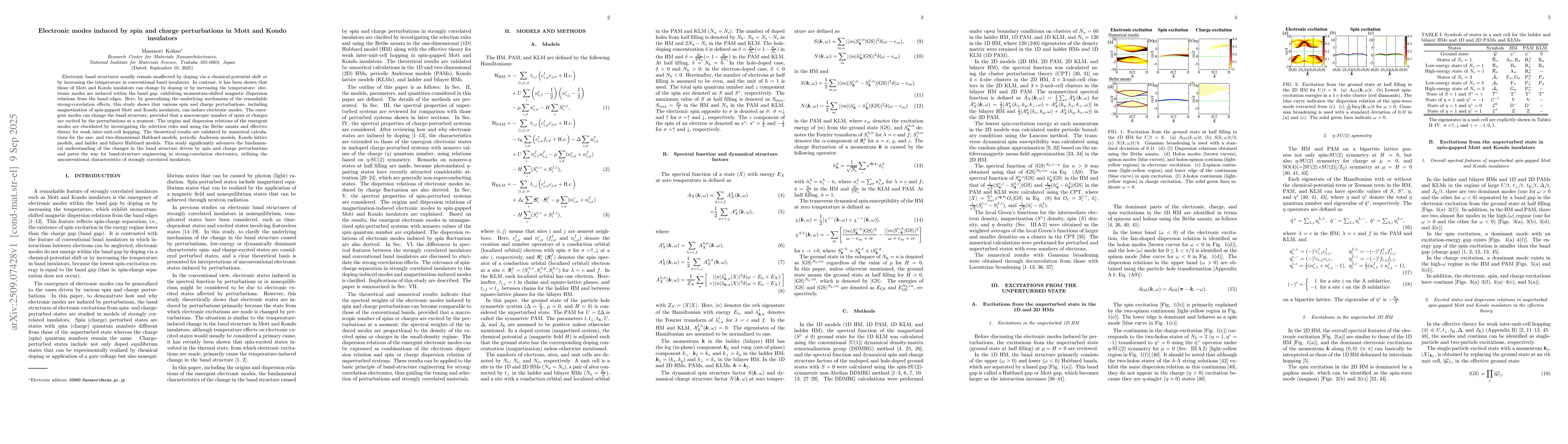 Electronic band structures usually remain unaffected by doping via a chemical-potential shift or by increasing the temperature in conventional band insulators. In contrast, it has been shown that those of Mott and Kondo insulators can change by doping or by increasing the temperature: electronic modes are induced within the band gap, exhibiting momentum-shifted magnetic dispersion relations from the band edges. Here, by generalizing the underlying mechanism of the remarkable strong-correlation effects, this study shows that various spin and charge perturbations, including magnetization of spin-gapped Mott and Kondo insulators, can induce electronic modes. The emergent modes can change the band structure, provided that a macroscopic number of spins or charges are excited by the perturbations at a moment. The origins and dispersion relations of the emergent modes are elucidated by investigating the selection rules and using the Bethe ansatz and effective theory for weak inter-unit-cell hopping. The theoretical results are validated by numerical calculations for the one- and two-dimensional Hubbard models, periodic Anderson models, Kondo lattice models, and ladder and bilayer Hubbard models. This study significantly advances the fundamental understanding of the changes in the band structure driven by spin and charge perturbations and paves the way for band-structure engineering in strong-correlation electronics, utilizing the unconventional characteristics of strongly correlated insulators.