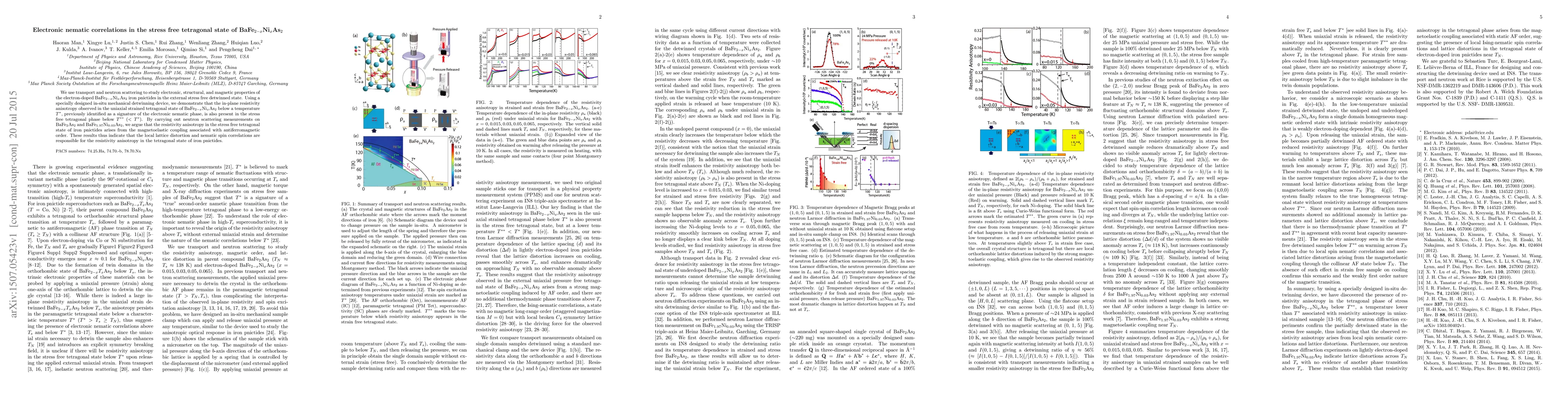 This study shows that resistivity anisotropy in stress-free tetragonal BaFe$_{2-x}$Ni$_{x}$As$_{2}$ below a certain temperature, previously linked to electronic nematicity, is also present in the absence of external stress. Neutron scattering suggests this anisotropy results from magnetoelastic coupling tied to antiferromagnetic order, indicating local lattice distortions and spin correlations underpin it.