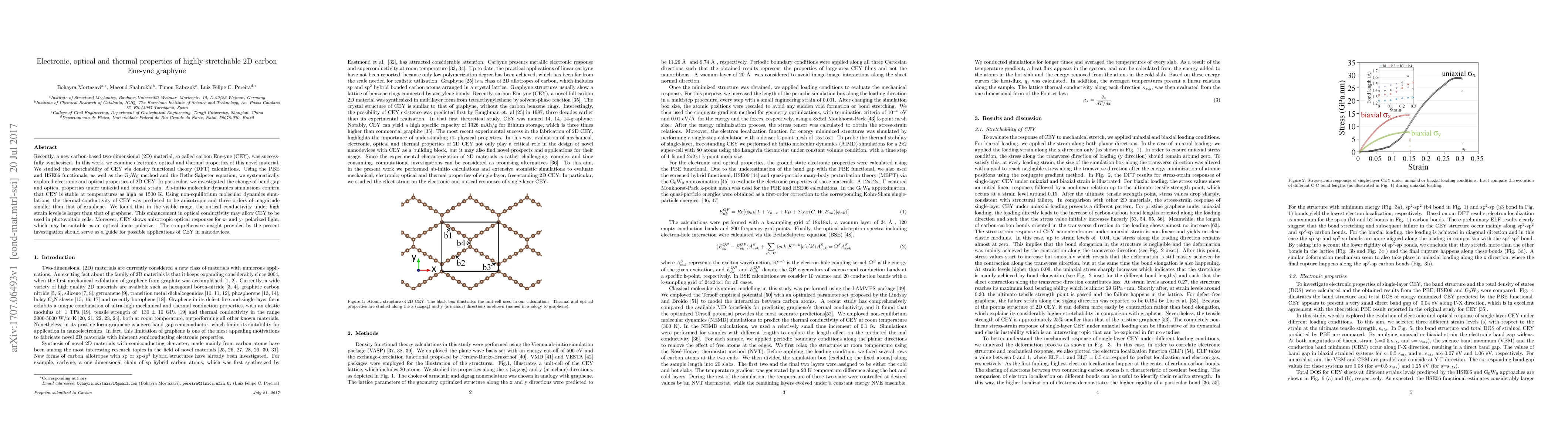 This paper investigates the electronic, optical, and thermal properties of a newly synthesized 2D carbon material called "carbon Ene-yne" (CEY) using DFT calculations and simulations. CEY exhibits anisotropic thermal conductivity and enhanced optical conductivity under strain, suggesting potential applications in photovoltaic cells and as an optical linear polarizer.