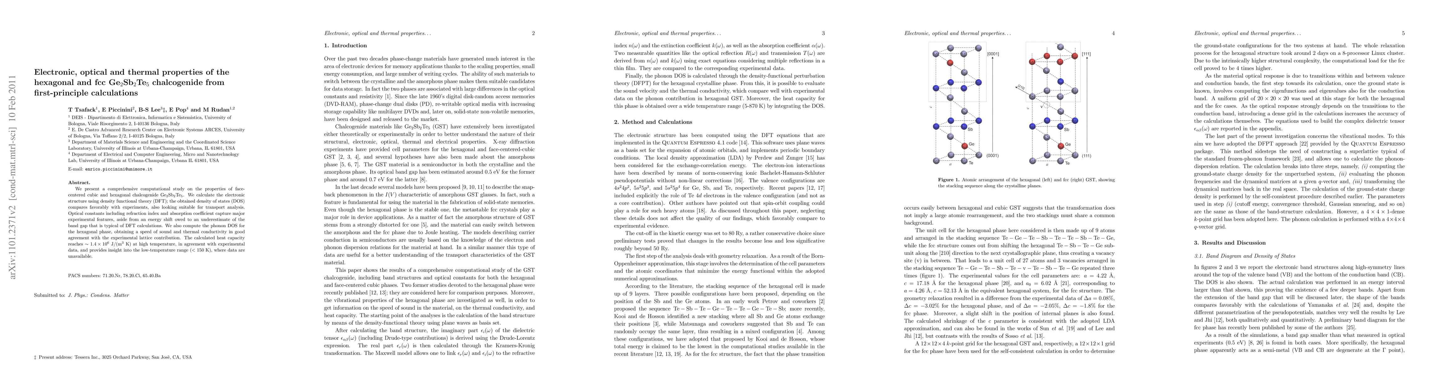This paper uses density functional theory to study the electronic, optical, and thermal properties of chalcogenide Ge2Sb2Te5 in both hexagonal and face-centered cubic phases. The calculated density of states and optical constants align well with experimental data, while phonon calculations provide a thermal conductivity and heat capacity that match experimental observations.