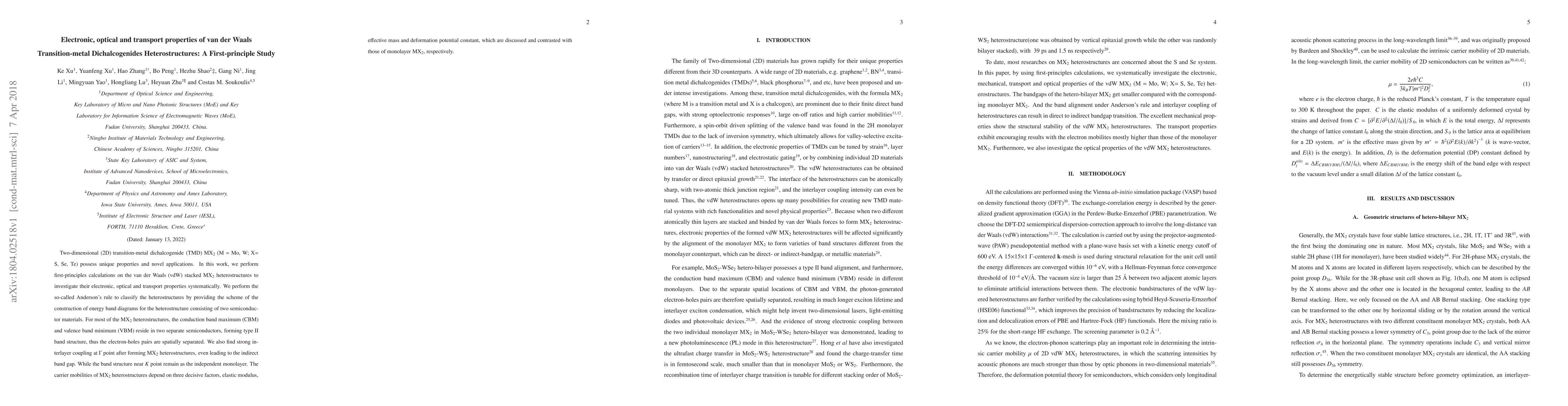 Two-dimensional (2D) transition-metal dichalcogenide (TMD) MX$_2$ (M = Mo, W; X= S, Se, Te) possess unique properties and novel applications. In this work, we perform first-principles calculations on the van der Waals (vdW) stacked MX$_2$ heterostructures to investigate their electronic, optical and transport properties systematically. We perform the so-called Anderson's rule to classify the heterostructures by providing the scheme of the construction of energy band diagrams for the heterostructure consisting of two semiconductor materials. For most of the MX$_2$ heterostructures, the conduction band maximum (CBM) and valence band minimum (VBM) reside in two separate semiconductors, forming type II band structure, thus the electron-holes pairs are spatially separated. We also find strong interlayer coupling at $\Gamma$ point after forming MX$_2$ heterostructures, even leading to the indirect band gap. While the band structure near $K$ point remain as the independent monolayer. The carrier mobilities of MX$_2$ heterostructures depend on three decisive factors, elastic modulus, effective mass and deformation potential constant, which are discussed and contrasted with those of monolayer MX$_2$, respectively.