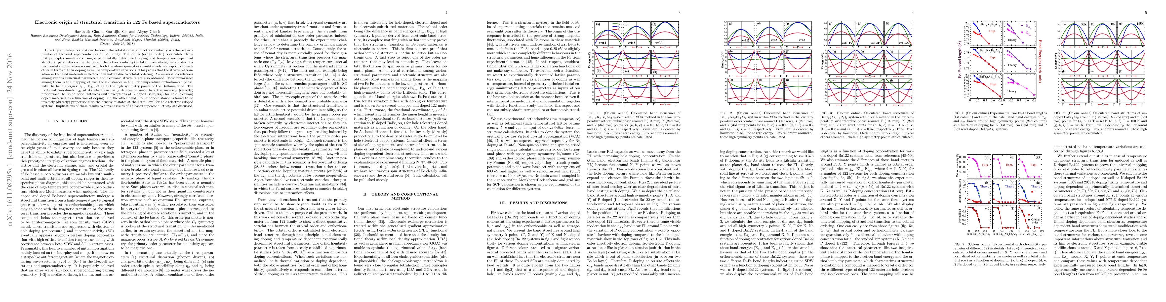 Direct quantitative correlations between the orbital order and orthorhombicity is achieved in a number of Fe-based superconductors of 122 family. The former (orbital order) is calculated from first principles simulations using experimentally determined doping and temperature dependent structural parameters while the latter (the orthorhombicity) is taken from already established experimental studies; when normalized, both the above quantities quantitatively corresponds to each other in terms of their doping as well as temperature variations. This proves that the structural transition in Fe-based materials is electronic in nature due to orbital ordering. An universal correlations among various structural parameters and electronic structure are also obtained. Most remarkable among them is the mapping of two Fe\--Fe distances in the low temperature orthorhombic phase, with the band energies E$_{d_{xz}}$, E$_{d_{yz}}$ of Fe at the high symmetry points of the Brillouin zone. The fractional co-ordinate $z_{As}$ of $As$ which essentially determines anion height is inversely (directly) proportional to Fe-As bond distances (with exceptions of K doped BaFe$_2$As$_2$) for hole (electron) doped materials as a function of doping. On the other hand, Fe-As bond-distance is found to be inversely (directly) proportional to the density of states at the Fermi level for hole (electron) doped systems. Implications of these results to current issues of Fe based superconductivity are discussed.