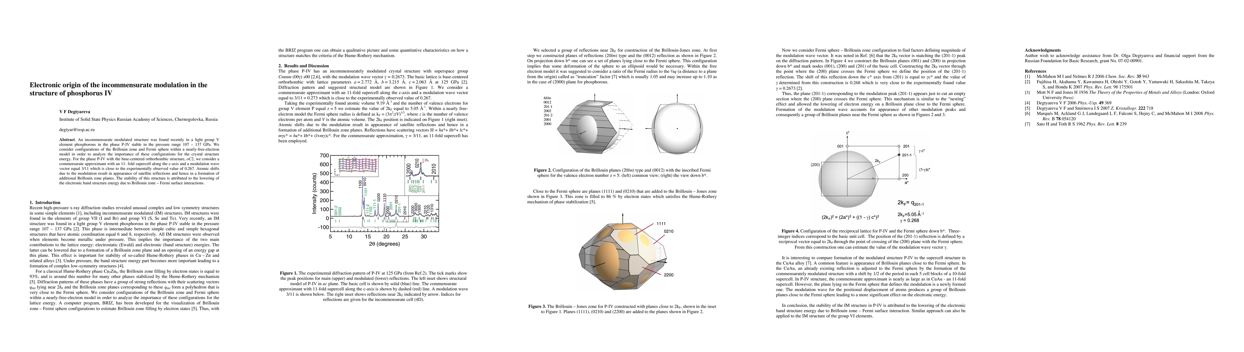 An incommensurate modulated structure was found recently in a light group V element phosphorous in the phase P-IV stable in the pressure range 107-137 GPa. We consider configurations of the Brillouin zone and Fermi sphere within a nearly-free-electron model in order to analyze the importance of these configurations for the crystal structure energy. For the phase P-IV with the base-centered orthorhombic structure, oC2, we consider a commensurate approximant with an 11-fold supercell along the c-axis and a modulation wave vector equal 3/11 which is close to the experimentally observed value of 0.267. Atomic shifts due to the modulation result in appearance of satellite reflections and hence in a formation of additional Brillouin zone planes. The stability of this structure is attributed to the lowering of the electronic band structure energy due to Brillouin zone - Fermi surface interactions.