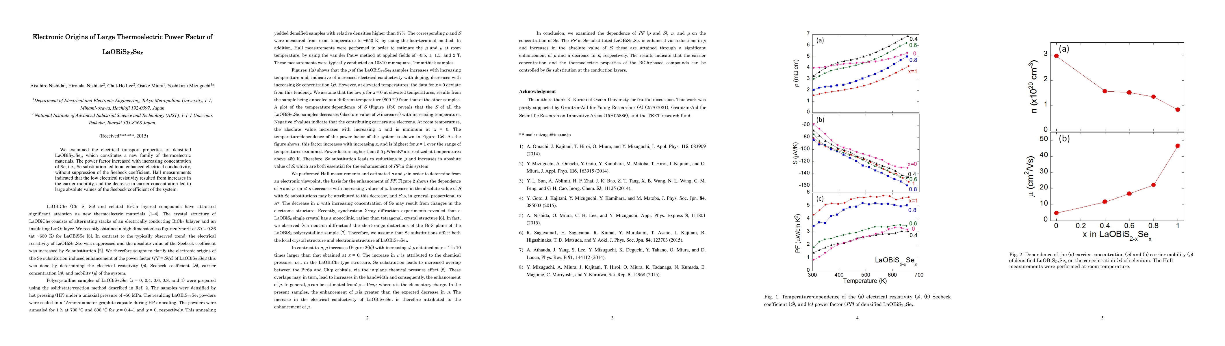 We examined the electrical transport properties of densified LaOBiS2-xSex, which constitutes a new family of thermoelectric materials. The power factor increased with increasing concentration of Se, i.e., Se substitution led to an enhanced electrical conductivity, without suppression of the Seebeck coefficient. Hall measurements indicated that the low electrical resistivity resulted from increases in the carrier mobility, and the decrease in carrier concentration led to large absolute values of the Seebeck coefficient of the system.