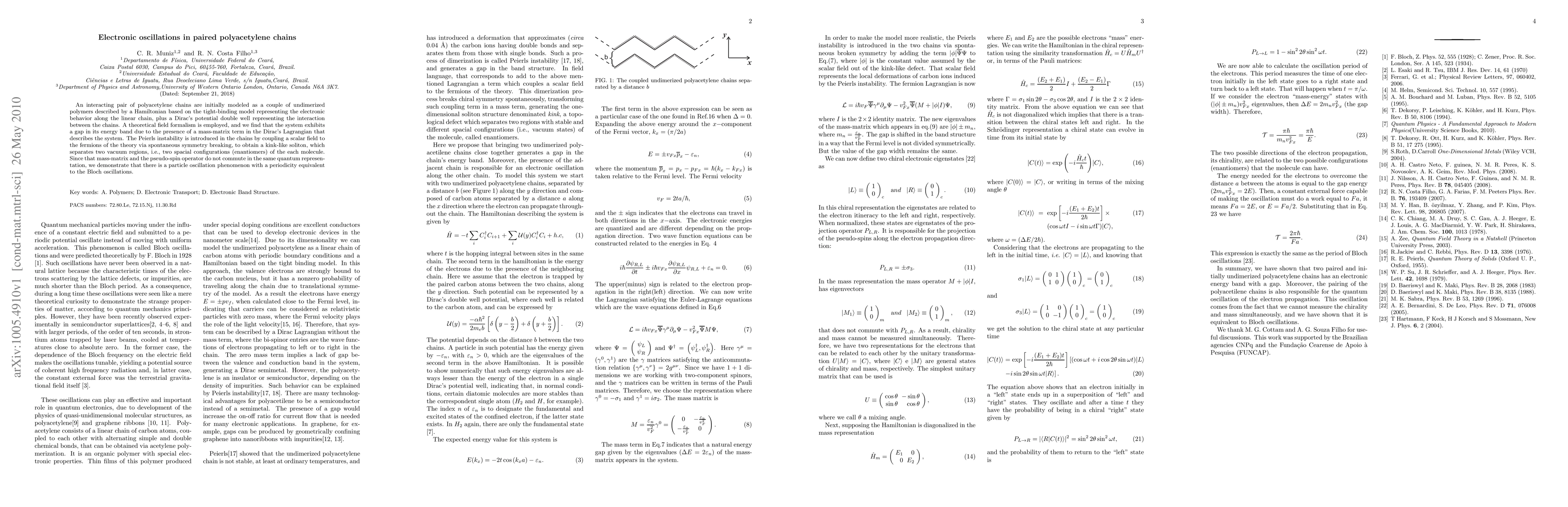 An interacting pair of polyacetylene chains are initially modeled as a couple of undimerized polymers described by a Hamiltonian based on the tight-binding model representing the electronic behavior along the linear chain, plus a Dirac's potential double well representing the interaction between the chains. A theoretical field formalism is employed, and we find that the system exhibits a gap in its energy band due to the presence of a mass-matrix term in the Dirac's Lagrangian that describes the system. The Peierls instability is introduced in the chains by coupling a scalar field to the fermions of the theory via spontaneous symmetry breaking, to obtain a kink-like soliton, which separates two vacuum regions, i.e., two spacial configurations (enantiomers) of the each molecule. Since that mass-matrix and the pseudo-spin operator do not commute in the same quantum representation, we demonstrate that there is a particle oscillation phenomenon with a periodicity equivalent to the Bloch oscillations.