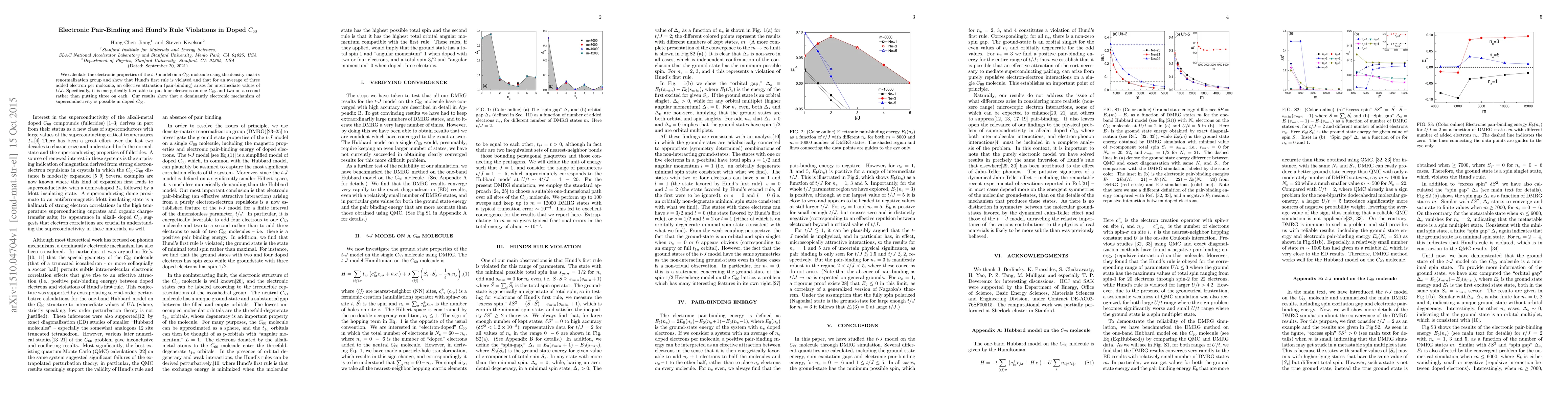This study reveals that the $t$-$J$ model on $C_{60}$ exhibits violations of Hund's first rule and demonstrates pair-binding for three added electrons, suggesting a potential electronic mechanism for superconductivity in doped $C_{60}$.