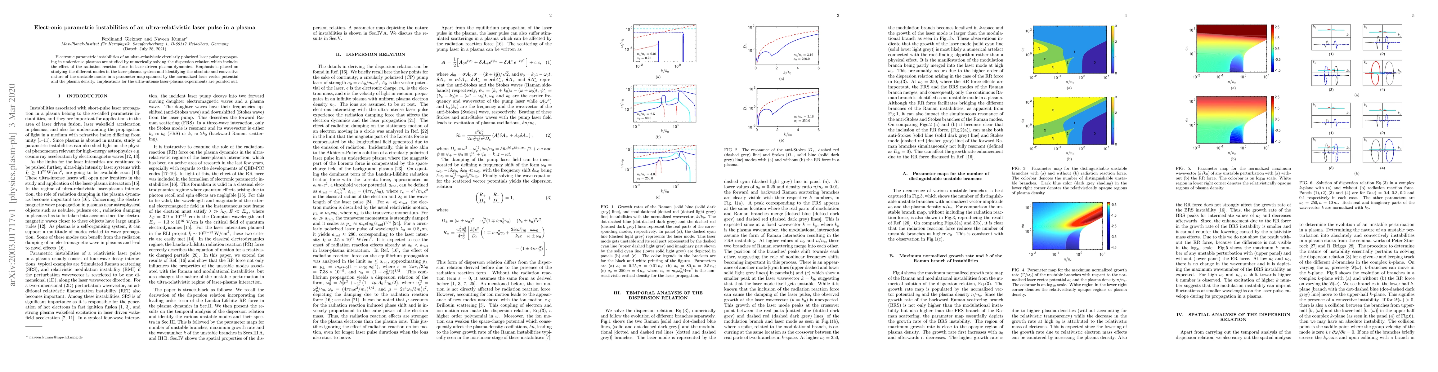 This paper investigates electronic parametric instabilities in ultrarelativistic laser pulses in underdense plasmas, focusing on different modes and their stability. Numerical solutions reveal the absolute and convective nature of unstable modes, with implications for ultraintense laser-plasma experiments.