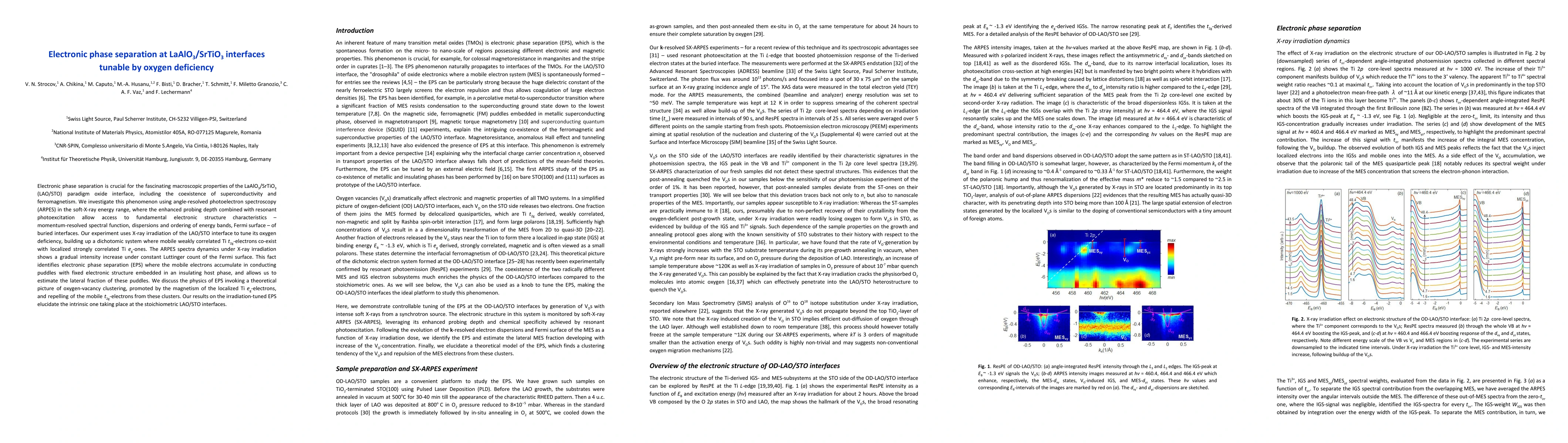 This paper investigates electronic phase separation at LaAlO3/SrTiO3 interfaces using angle-resolved photoelectron spectroscopy, finding that oxygen deficiency induced by X-ray irradiation promotes mobile weakly correlated electrons to accumulate in conducting regions, while leaving an insulating background. The study reveals the intrinsic electronic phase separation mechanism at stoichiometric interfaces through the formation of oxygen-vacancy clusters.