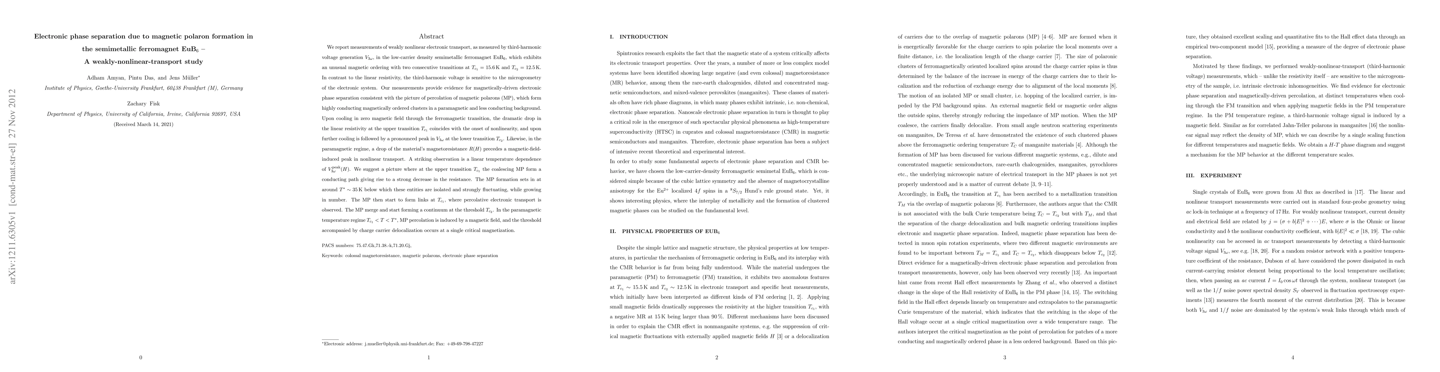 We report measurements of weakly nonlinear electronic transport, as measured by third-harmonic voltage generation $V_{3\omega}$, in the low-carrier density semimetallic ferromagnet EuB$_6$, which exhibits an unusual magnetic ordering with two consecutive transitions at $T_{c_1} = 15.6$\,K and $T_{c_2} = 12.5$\,K. Upon cooling in zero magnetic field through the ferromagnetic transition, the dramatic drop in the linear resistivity at the upper transition $T_{c_1}$ coincides with the onset of nonlinearity, and upon further cooling is followed by a pronounced peak in $V_{3 \omega}$ at the lower transition $T_{c_2}$. Likewise, in the paramagnetic regime, a drop of the material's magnetoresistance $R(H)$ precedes a magnetic-field-induced peak in nonlinear transport. A striking observation is a linear temperature dependence of $V_{3\omega}^{\rm peak}(H)$. We suggest a picture where at the upper transition $T_{c_1}$ the coalescing MP form a conducting path giving rise to a strong decrease in the resistance. The MP formation sets in at around $T^\ast \sim 35$\,K below which these entities are isolated and strongly fluctuating, while growing in number. The MP then start to form links at $T_{c_1}$, where percolative electronic transport is observed. The MP merge and start forming a continuum at the threshold $T_{c_2}$. In the paramagnetic temperature regime $T_{c_1} < T < T^\ast$, MP percolation is induced by a magnetic field, and the threshold accompanied by charge carrier delocalization occurs at a single critical magnetization.