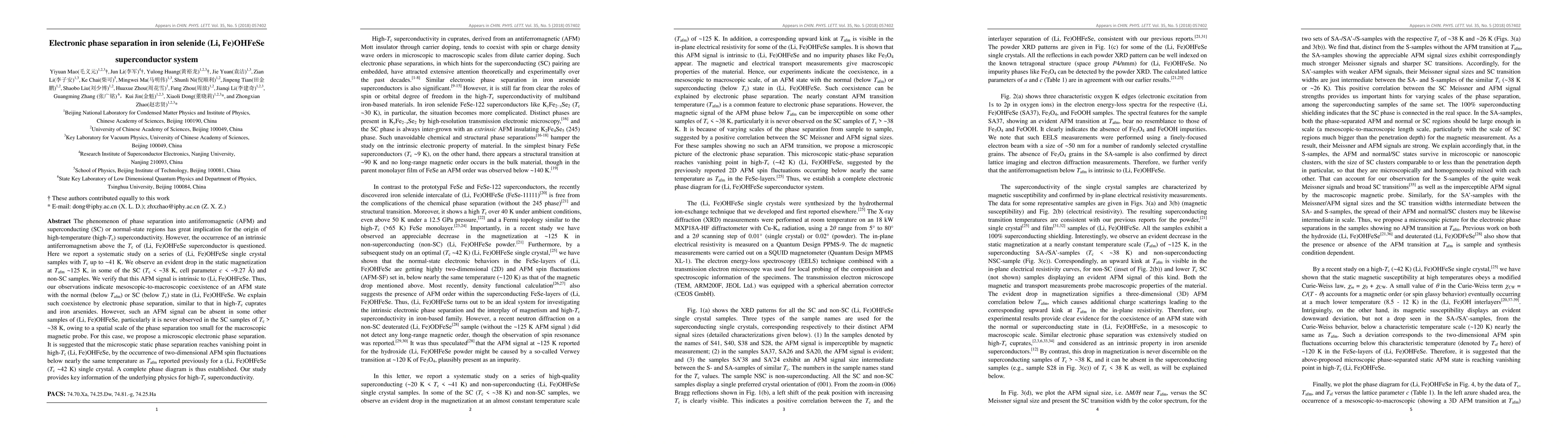 The research investigates electronic phase separation in (Li, Fe)OHFeSe superconductors, finding intrinsic antiferromagnetic (AFM) regions coexist with superconducting or normal states. While AFM signals are present in some samples, they are absent in high-temperature superconductors due to a microscopic electronic phase separation. This study establishes a complete phase diagram and sheds light on the underlying physics of high-temperature superconductivity.