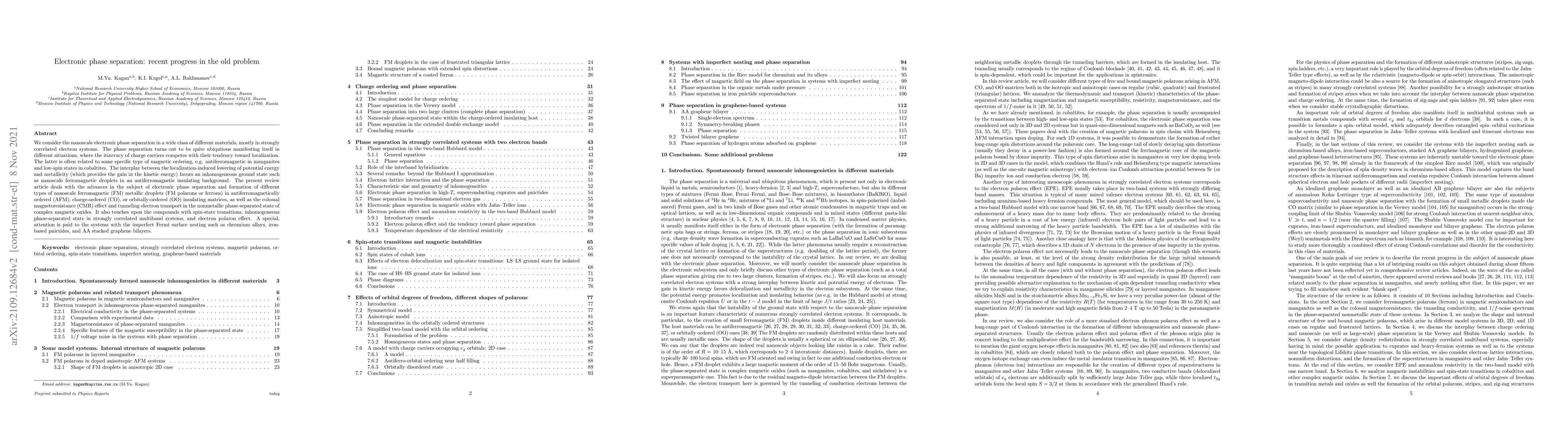 We consider the nanoscale electronic phase separation in a wide class of different materials, mostly in strongly correlated electron systems. The phase separation turns out to be quite ubiquitous manifesting itself in different situations, where the itineracy of charge carriers competes with their tendency toward localization. The latter is often related to some specific type of magnetic ordering, e.g. antiferromagnetic in manganites and low-spin states in cobaltites. The interplay between the localization-induced lowering of potential energy and metallicity (which provides the gain in the kinetic energy) favors an inhomogeneous ground state such as nanoscale ferromagnetic droplets in an antiferromagnetic insulating background. The present review article deals with the advances in the subject of electronic phase separation and formation of different types of nanoscale ferromagnetic (FM) metallic droplets (FM polarons or ferrons) in antiferromagnetically ordered (AFM), charge-ordered (CO), or orbitally-ordered (OO) insulating matrices, as well as the colossal magnetoresistance (CMR) effect and tunneling electron transport in the nonmetallic phase-separated state of complex magnetic oxides. It also touches upon the compounds with spin-state transitions, inhomogeneous phase-separated state in strongly correlated multiband systems, and electron polaron effect. A special, attention is paid to the systems with the imperfect Fermi surface nesting such as chromium alloys, iron-based pnictides, and AA stacked graphene bilayers.