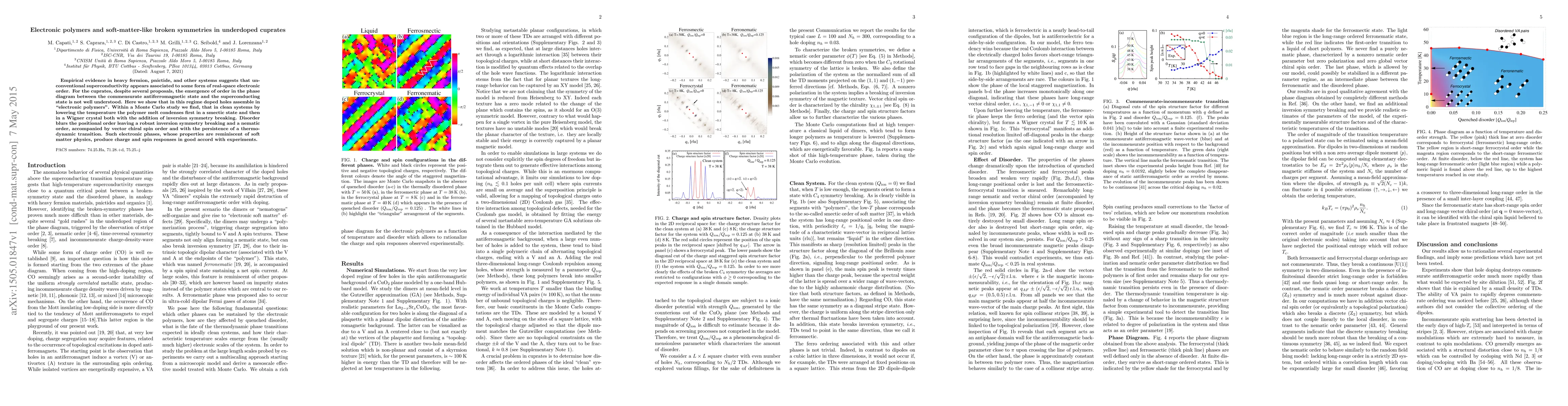 Empirical evidence in heavy fermion, pnictide, and other systems suggests that unconventional superconductivity appears associated to some form of real-space electronic order. For the cuprates, despite several proposals, the emergence of order in the phase diagram between the commensurate antiferromagnetic state and the superconducting state is not well understood. Here we show that in this regime doped holes assemble in "electronic polymers." Within a Monte Carlo study we find, that in clean systems by lowering the temperature the polymer melt condenses first in a smectic state and then in a Wigner crystal both with the addition of inversion symmetry breaking. Disorder blurs the positional order leaving a robust inversion symmetry breaking and a nematic order, accompanied by vector chiral spin order and with the persistence of a thermodynamic transition. Such electronic phases, whose properties are reminiscent of soft-matter physics, produce charge and spin responses in good accord with experiments.