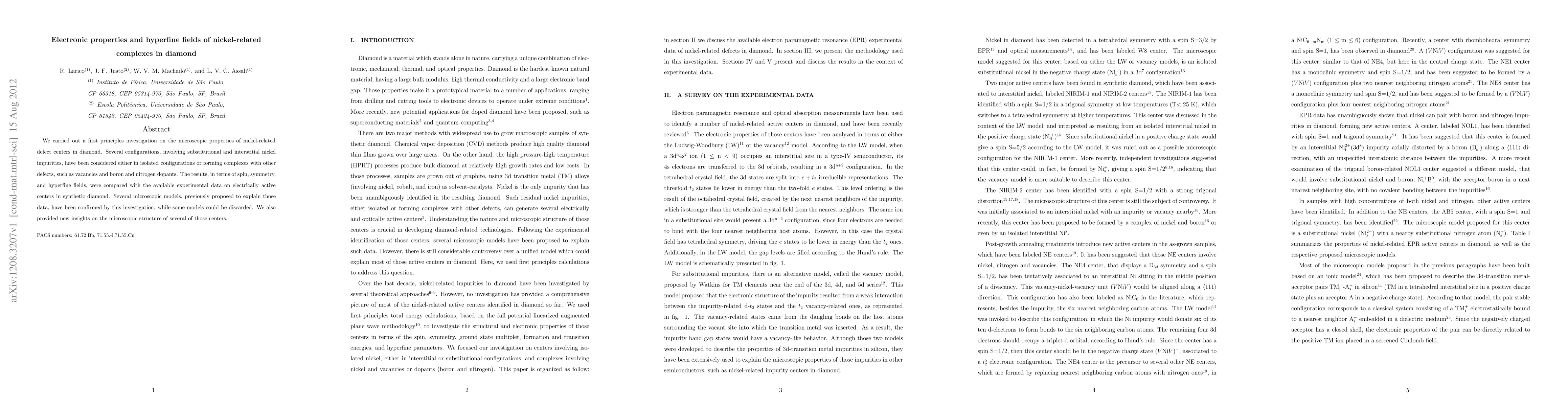 This research uses first principles calculations to study nickel-related defect centers in diamond, examining various configurations and their electronic properties. The study confirms existing microscopic models and provides new insights into the structure of these centers, aligning with experimental data on electrically active centers.