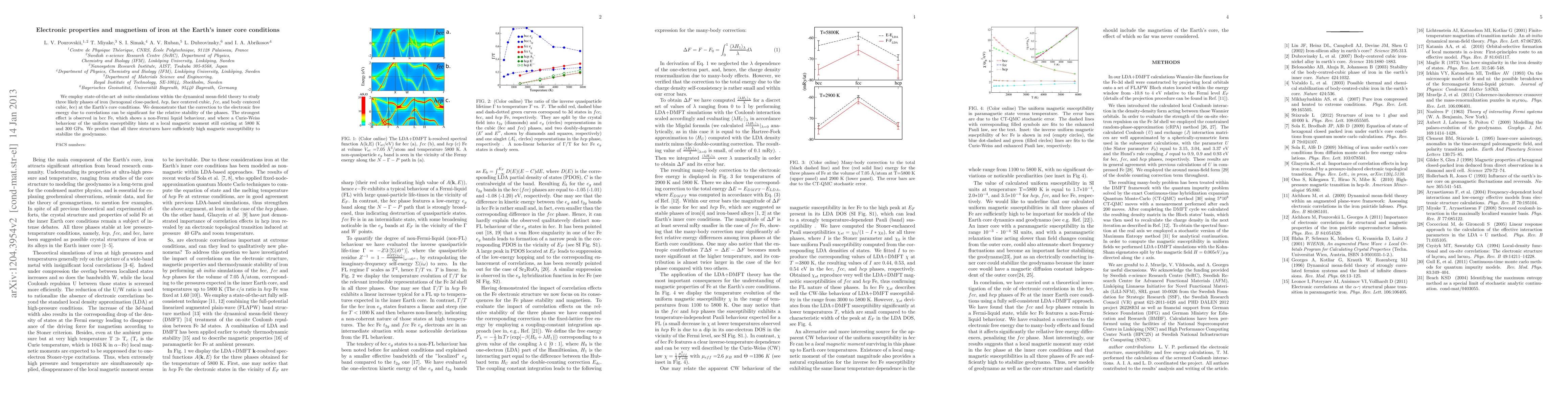 This study uses advanced simulations to explore the electronic and magnetic properties of iron under Earth's inner core conditions, finding significant correlation effects that stabilize different iron phases. Notably, bcc iron exhibits non-Fermi liquid behavior and retains a local magnetic moment even at extreme temperatures, suggesting all phases could support the geodynamo.
