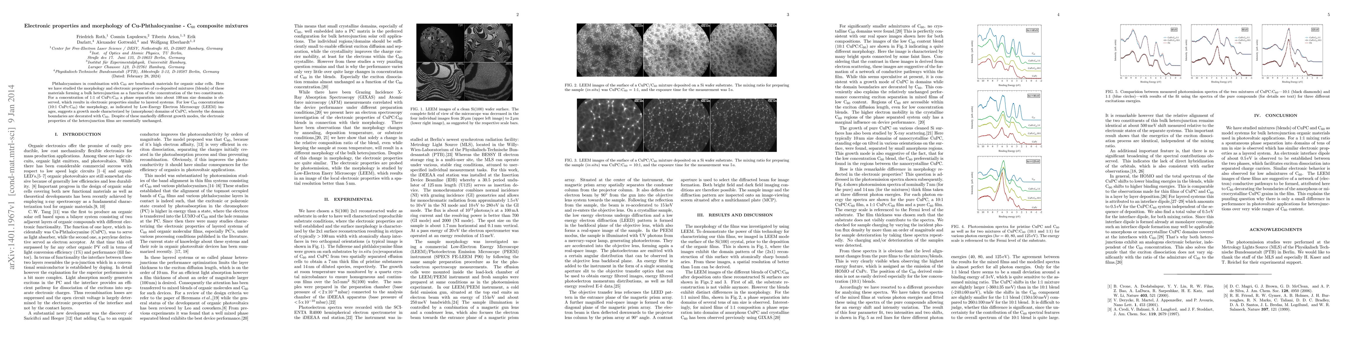 This study investigates the morphology and electronic properties of Cu-Phthalocyanine (CuPc) and C$_{60}$ composite blends, revealing distinct phase separation and growth modes at different concentrations, yet maintaining similar electronic properties across varied morphologies.