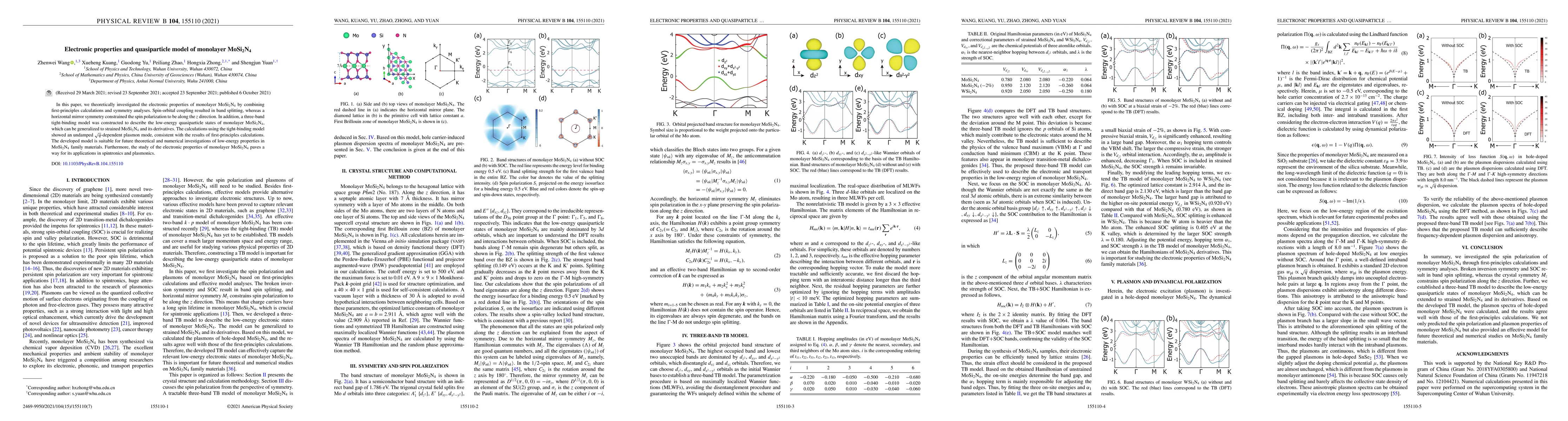 This paper investigates the electronic properties of monolayer MoSi$_2$N$_4$ using first-principles calculations and symmetry analysis, revealing spin polarization and constructing a three-band tight-binding model for low-energy quasi-particle states, which is also applicable to strained variants. The findings suggest potential applications in spintronics and plasmonics.