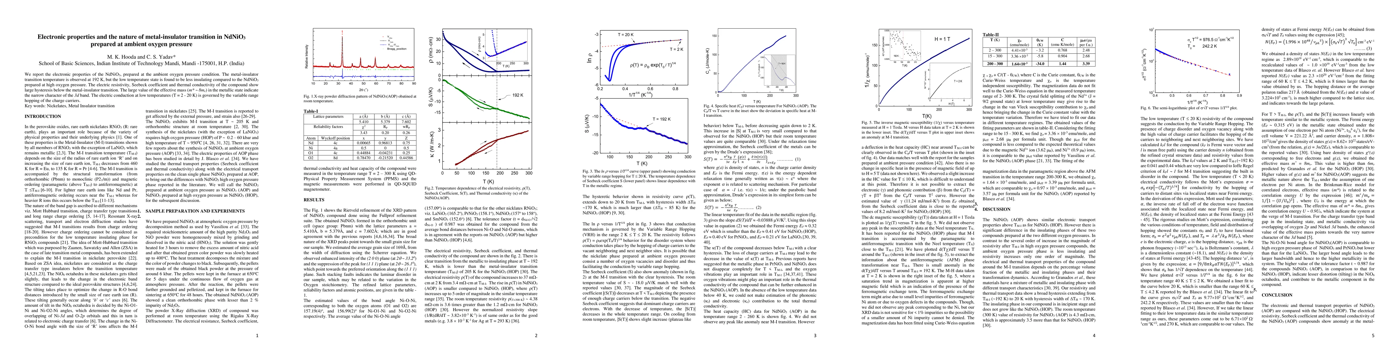 Summary: This study investigates NdNiO3 prepared at ambient oxygen pressure, finding a metal-insulator transition at 192 K with less insulating properties compared to high oxygen pressure samples. The compound exhibits large hysteresis in resistivity, Seebeck coefficient, and thermal conductivity below transition temperature, indicative of narrow 3d band character, and variable range hopping governs low-temperature conduction.