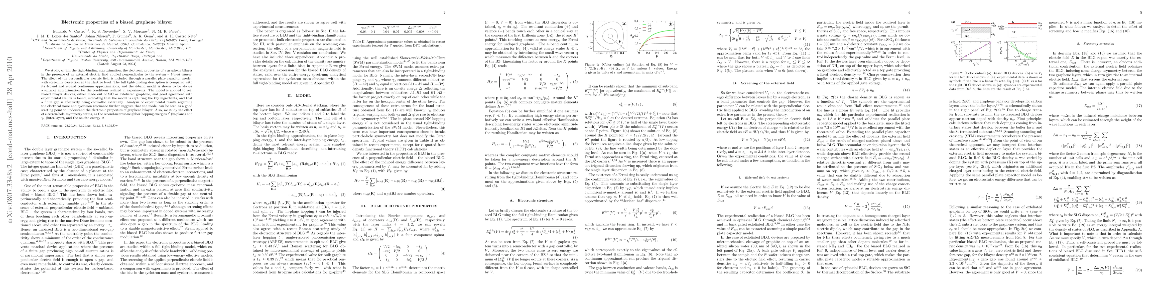 We study, within the tight-binding approximation, the electronic properties of a graphene bilayer in the presence of an external electric field applied perpendicular to the system -- \emph{biased bilayer}. The effect of the perpendicular electric field is included through a parallel plate capacitor model, with screening correction at the Hartree level. The full tight-binding description is compared with its 4-band and 2-band continuum approximations, and the 4-band model is shown to be always a suitable approximation for the conditions realized in experiments. The model is applied to real biased bilayer devices, either made out of SiC or exfoliated graphene, and good agreement with experimental results is found, indicating that the model is capturing the key ingredients, and that a finite gap is effectively being controlled externally. Analysis of experimental results regarding the electrical noise and cyclotron resonance further suggests that the model can be seen as a good starting point to understand the electronic properties of graphene bilayer. Also, we study the effect of electron-hole asymmetry terms, as the second-nearest-neighbor hopping energies $t'$ (in-plane) and $\gamma_{4}$ (inter-layer), and the on-site energy $\Delta$.